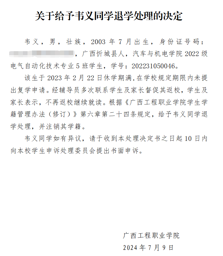 因韦义同学已离校难于联系,无法通过直接送达、留置送达、邮寄送达等方式送达,现通过beat365唯一官网汽车与机电学院官网予以公告,公告时间为2024年10月10日至2024年11月10日,公告期满,即视为送达。