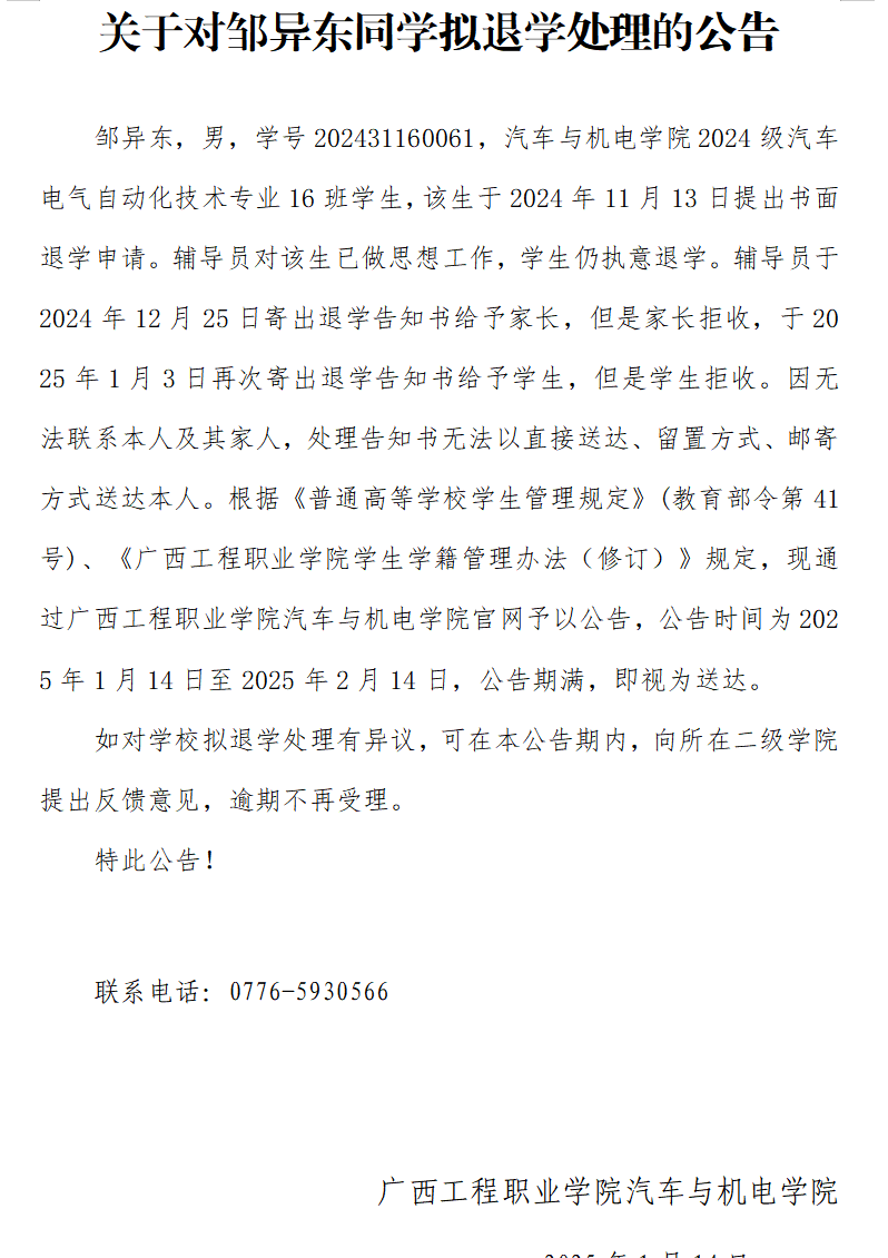 上一篇:关于对蒋中标同学拟退学处理的公告