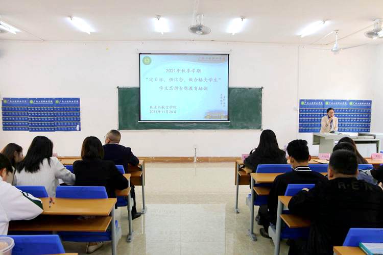 为进一步加强大学生思想政治教育,培育和践行社会主义核心价值观,促进广大青年在新时代中主动作为、勇担责任,践行“请党放心、强国有我”青春誓言,11月25日下午,学校铁道与航空学院在新经管楼102室召开2021年秋季学期“定目标,强信念,做合格大学生”学生思想专题教育培训。校党委委员、副校长彭高彬作专题讲座,铁道与航空学院党支部书记、副院长覃凤姣,学生科科长谢小玲、全体辅导员以及2020级学生代表参加培训。