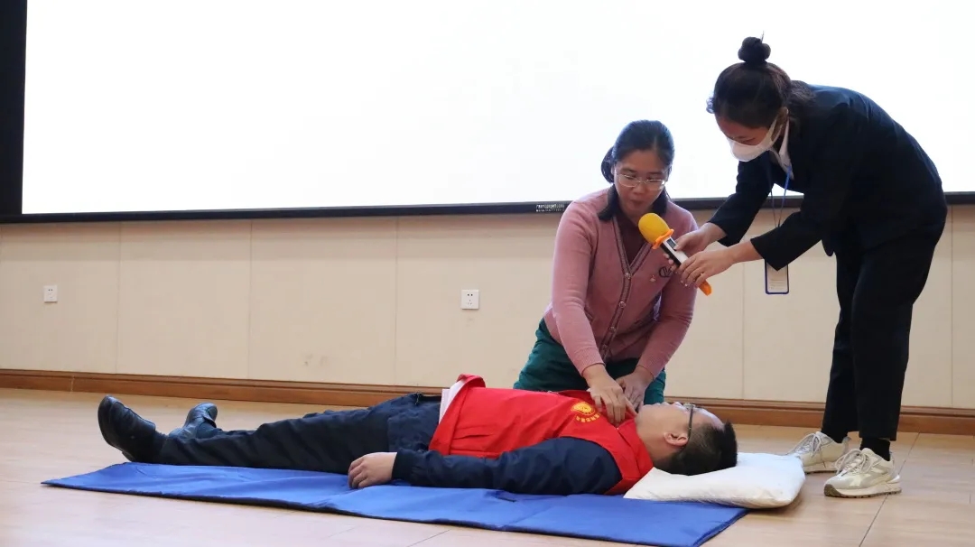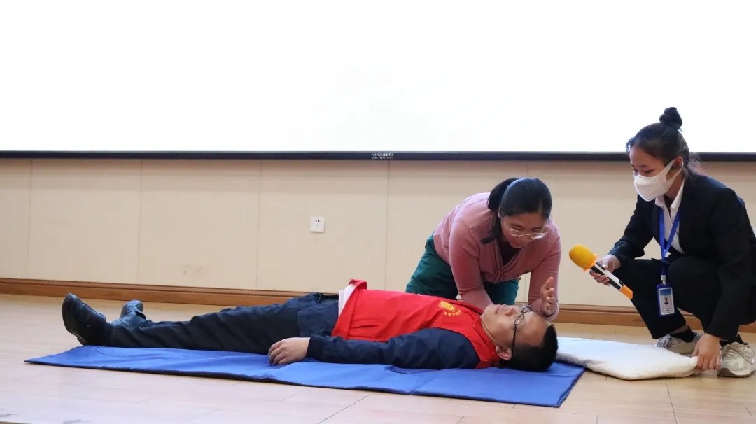 最后,平果市人民医院医院副院长零达格作心肺复苏专题培训。零达格副院长以通俗易懂的语言、生动形象的演示,详细讲授了心肺复苏的理论知识、流程、步骤以及注意事项,希望同学们掌握急救技能,牢记“时间就是生命”,能够在第一时间挽救更多生命。医护人员还现场演练心肺复苏、人工呼吸等技能的操作规程和一般要领.