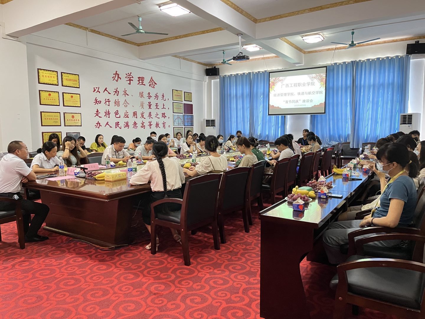 为庆祝2022年教师节、中秋节,进一步营造浓厚的节日氛围,团结凝聚beat365教师以习近平新时代中国特色社会主义思想铸魂育人,9月9日,铁道与航空学院和经济管理学院联合举行”中秋节、教师节,双节同庆“座谈会。学校纪委书记、副校长彭高彬,铁道与航空学院院长覃凤姣,经济管理学院院长庞英连,以及两个学院全体教师一同参加此次座谈会。