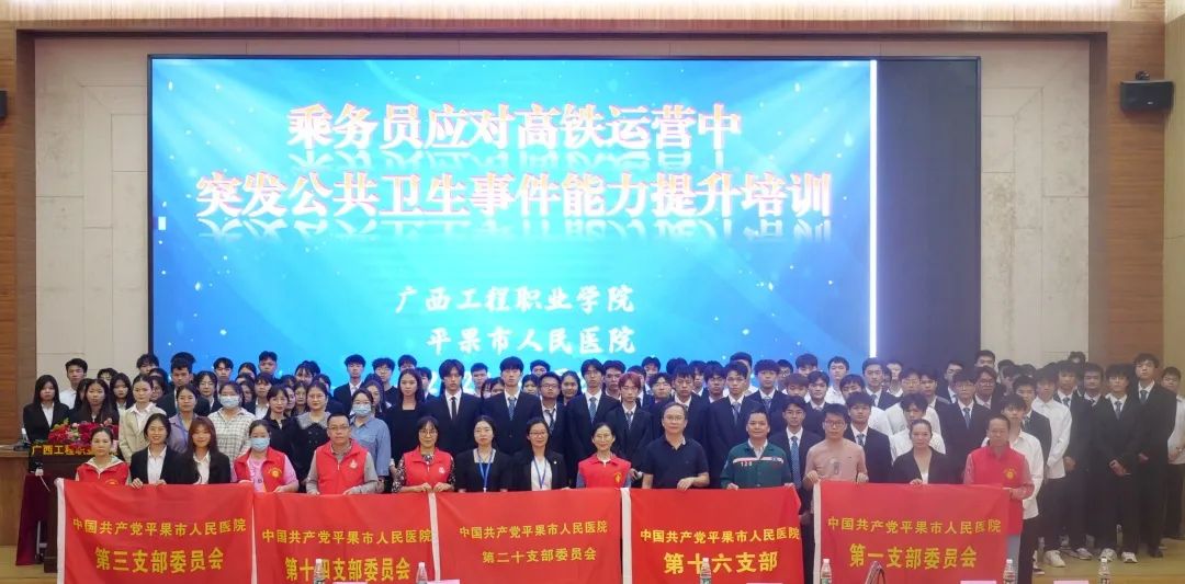 为进一步提升高速铁路客运服务专业学生的应急处置能力、应急处理的协调配合以及保障应急处置的效果,有效预防、及时控制和消除突发公共卫生事件的危害,为铁路企业培养出具有一定应急处理能力的、高素质技术技能人才,铁道与航空学院联合平果市人民医院于3月24日下午在校图文信息大楼一楼学术报告厅开展乘务员应对高铁运营中突发公共卫生事件能力提升培训活动暨平果市人民医院健康知识进校园文明实践志愿服务活动 。