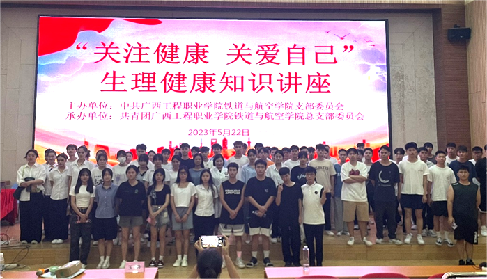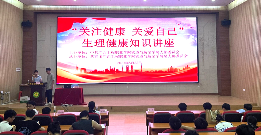为增强广大学生对青春期生理知识的了解,加强青春期生理健康教育,增强防范和自我保护意识,提高学生健康意识与水平,树立健康生活理念。铁道与航空学院于5月22日晚在图文信息大楼一楼学术报告厅和图文信息大楼五楼学术报告厅同时开展“关注健康,关爱自己”生理健康知识讲座。本次讲座由平果市妇幼保健院妇产科副主任医师玉丹和平果市妇幼保健院副主任医师覃文娟主讲。铁道与航空学院党支部书记、院长覃凤姣、党支部副书记宋蓉、党支部宣传委员办公室主任黄晶晶、学生科长谢小玲、辅导员黄家欢、莫礼伟、黄满秋、韩姣龙、马丹丹、及学生代表到场聆听讲座。