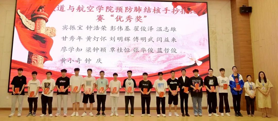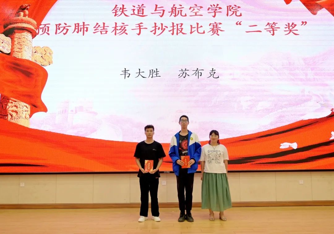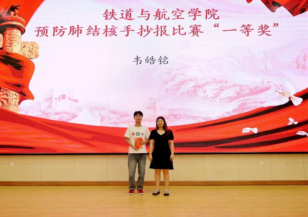 马丹丹老师为获得预防肺结核手抄报比赛“一等奖”的同学颁发荣誉证书