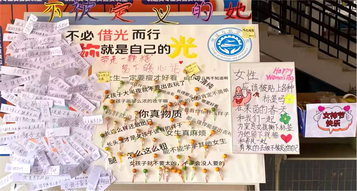 活动伊始,学生会成员先在展板上粘贴了女性的标签,通过展板展示,让学院女生撕下标签,打破外界对女生的偏见、束缚和刻板印象,并且重新贴上给予自己及她人的祝福语。激励大家解开束缚,自信地做自己。活动过程中,吸引了学院众多老师和同学们的关注,她们都表示此次活动新颖,极具意义。