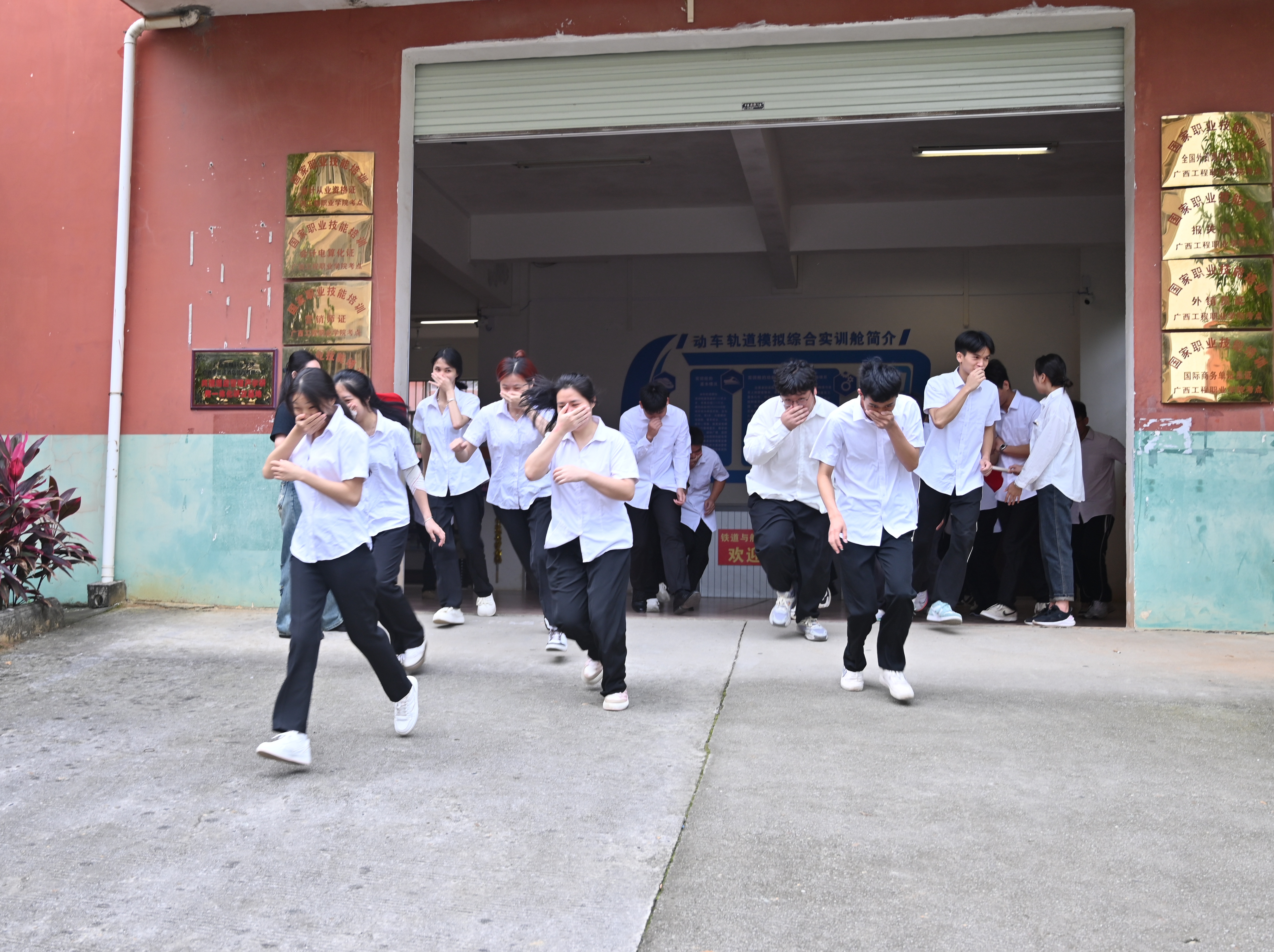 在活动过程中,实验实训室浓烟滚滚,室内烟雾报警器响起后,同学们手持湿毛巾掩住口鼻,采取低姿势迅速从安全通道迅速撤离撤离实验实训室来到学院楼门口的空地。