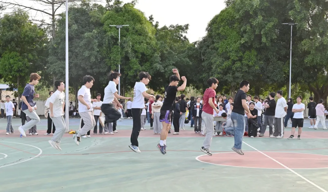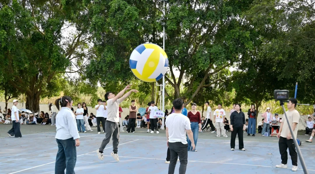 校庆活动以体育竞技为亮点,在运动场上激情绽放。巨型排球赛中,同学们精神抖擞,严阵以待。扣球瞬间,选手们高高跃起,以雷霆之势将球扣杀,每一个动作都凝聚着团队的默契与拼搏,场边的阵阵喝彩是对他们体育精神的最好褒奖。