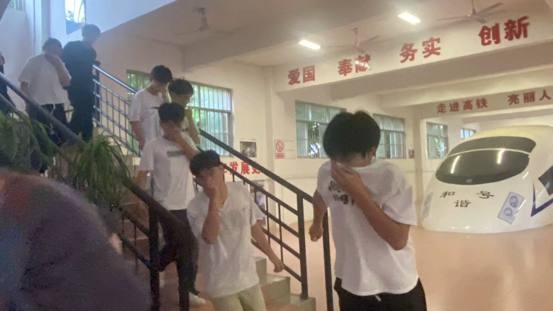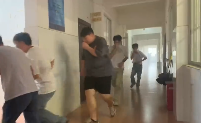 在活动过程中,实验实训室浓烟滚滚,室内烟雾报警器响起后,同学们手持湿毛巾掩住口鼻,采取低姿势迅速从安全通道迅速撤离实验实训室来到学院楼门口的空地。