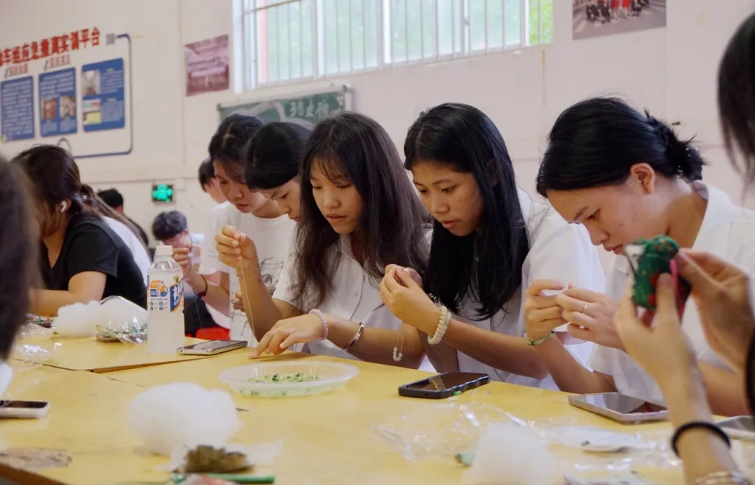 在手链制作区域,五彩丝线、精美珠子等材料整齐摆放。同学们充分发挥创意,将象征吉祥如意的五彩丝线与珠子巧妙搭配,编织出一条条独具个性的端午手链。大家相互交流编织技巧,欢声笑语不断。