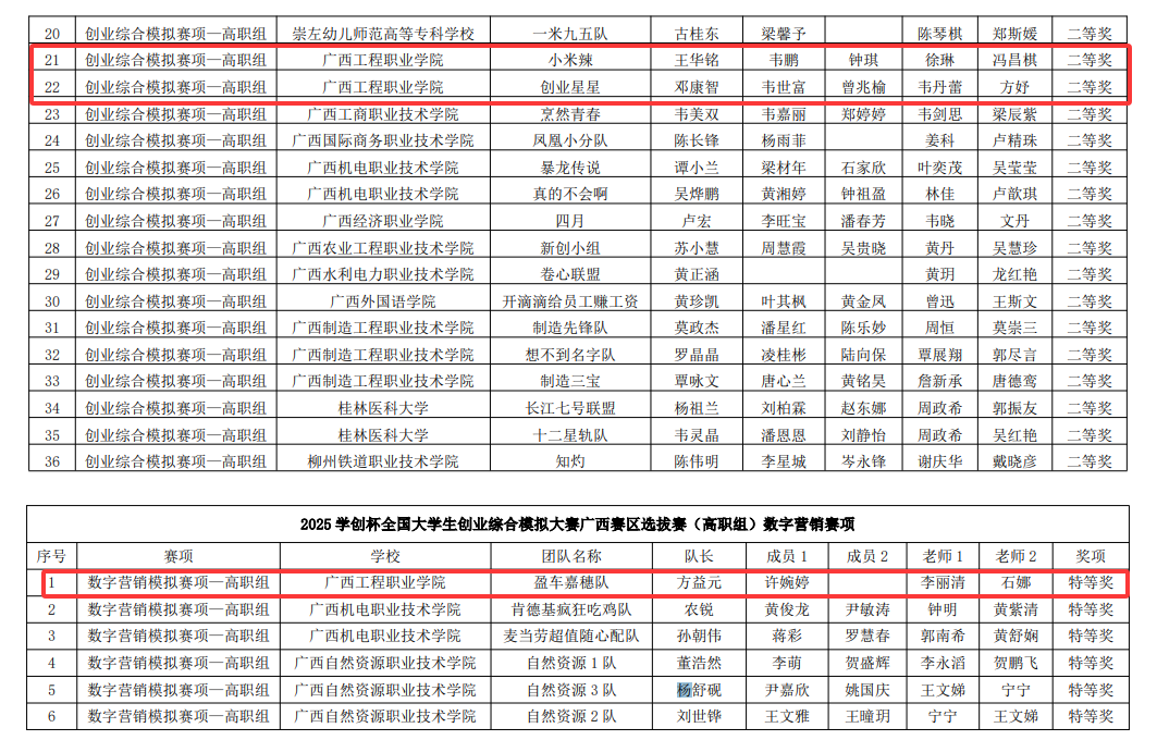 6月27日—28日,2025年第十二届“学创杯”全国大学生创业综合模拟大赛广西赛区选拔赛(职教组)在柳州职业技术大学举行,本次选拔赛(职教组)共有32所高校、500余师生参与竞赛。我院徐琳、韦丹蕾两位老师带领2023级城市轨道交通工程技术专业方益元等同学参加了此次比赛,荣获特等奖1项、一等奖1项、二等奖1项!