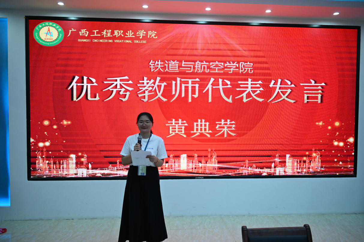 紧接着,优秀教师代表黄典荣发言,她对学校的精心栽培表示衷心的感谢,并如何激发学生的主动性与创造力以及如何引导学生树立正确的价值观和职业观两方面分享了自己的优秀教学方法,力求与各位同仁携手并进,为培养更多高素质技术技能人才贡献自己的力量。