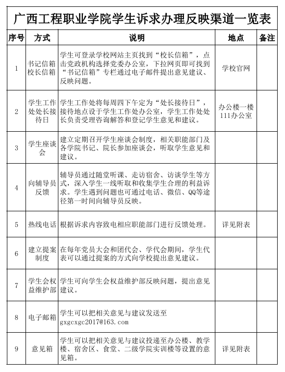 为切实保障学生诉求信息渠道畅通,切实解决学生反馈问题与诉求,经研究,在校内设立9个反馈渠道,主动对接、及时回应学生相关诉求。现将相关反馈渠道已通知如下: