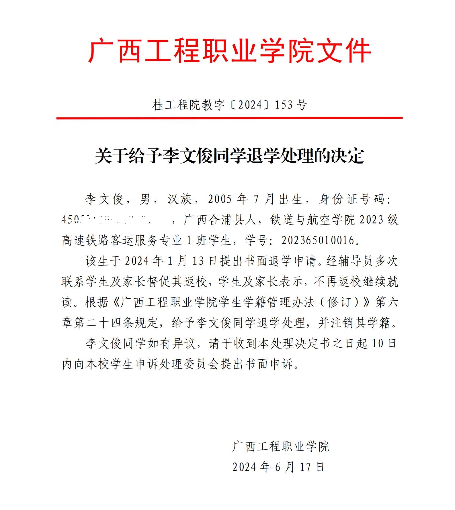 根据《普通高等学校学生管理规定》(教育部令第41号)、《beat365唯一官网学生学籍管理办法(修订)》第二十四条规定,给予李文俊同学退学处理,并注销其学籍。