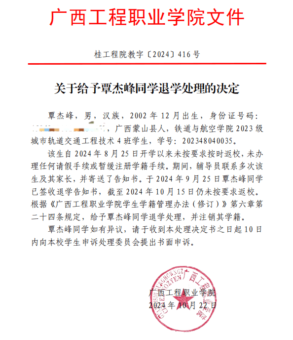 根据《普通高等学校学生管理规定》(教育部令第41号)、《beat365唯一官网学生学籍管理办法(修订)》第二十四条规定,给予覃杰峰同学退学处理,并注销其学籍。