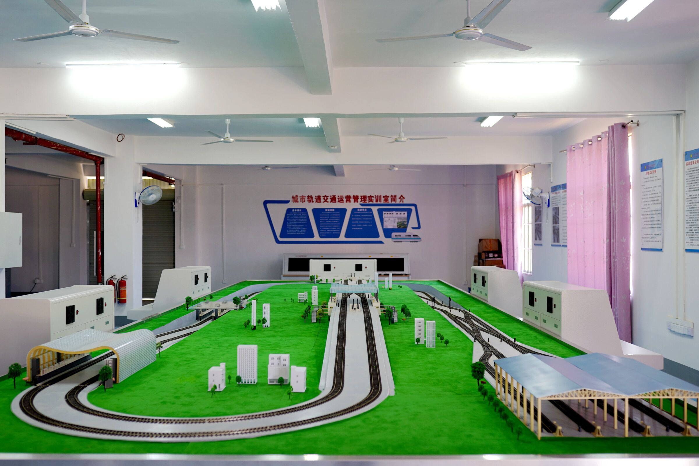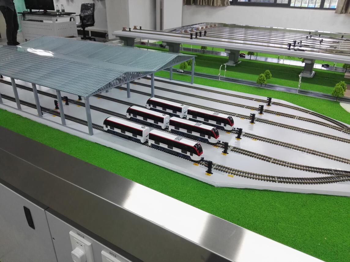 该实训室配套城市轨道交通运营沙盘实训系统,是为了使运输、信号及车务培训工作与地铁未来发展相适应而建成的,其核心目标是通过先进的计算机模拟技术为城市轨道交通培训教学搭建一个以网络为基础、与实际操作环境相同,与轨道交通模型设备进行联动的多媒体教学学习平台。实训室配备模拟地铁运营控制中心、车站控制室、车辆段调度操作平台。实训系统包括1套0CC中心ATS仿真系统、4套车站ATS仿真系统、1套车辆段计算机联锁仿真系统、1套大屏显示系统、1套教员管理系统和1套实物沙盘组成。