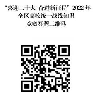 为深入学习宣传习近平总书记关于做好新时代党的统一战线工作的重要思想,学习宣传贯彻中央、自治区党委统战工作会议精神,深化党史学习教育和深入学习宣传《中国共产党统一战线工作条例》,积极推动统战知识进校园,引导广大师生以赛促学、以赛促宣,在浓厚的学习氛围中凝聚团结奋斗共识,喜迎党的二十大顺利召开,自治区党委教育工委举办“喜迎二十大·奋进新征程”2022年全区高校统一战线知识竞赛活动。请全校师生积极扫码参赛。