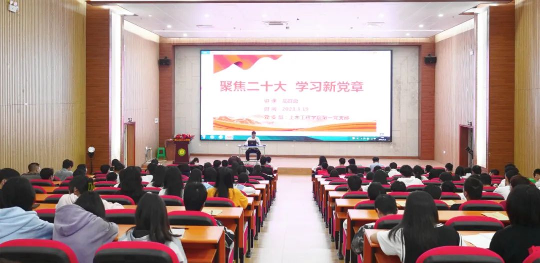 土木工程学院第一党支部把学习好、宣传好、贯彻好党的二十大精神作为当前和今后一个时期的首要政治任务。为深入学习贯彻党的二十大精神,深刻领会新党章内涵和变化,进一步提升党员的党性修养和作风建设,营造全院上下学党章,强党性,守党纪的良好氛围。2023年3月19日晚上19:30,土木工程学院第一党支部在图文信息大楼一楼学术报告厅,组织召开“聚焦二十大,学习新党章”主题党课学习会,本次党课由党支部书记龙群良同志主讲,土木工程学院第一党支部全体教师党员、入党积极分子、入党申请人、学生干部按时参加了党课学习。