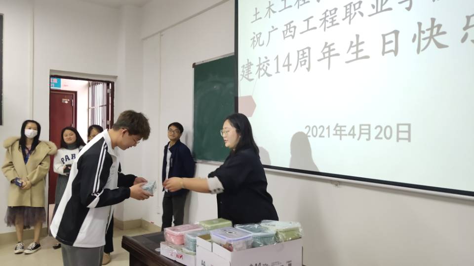 最后,在学生科长陈春任的组织下,全体师生通过观看学校的发展史宣传片、有奖问答活动、发放校庆餐票、礼品,大家欢聚一起,共同庆祝学校建校14周年。