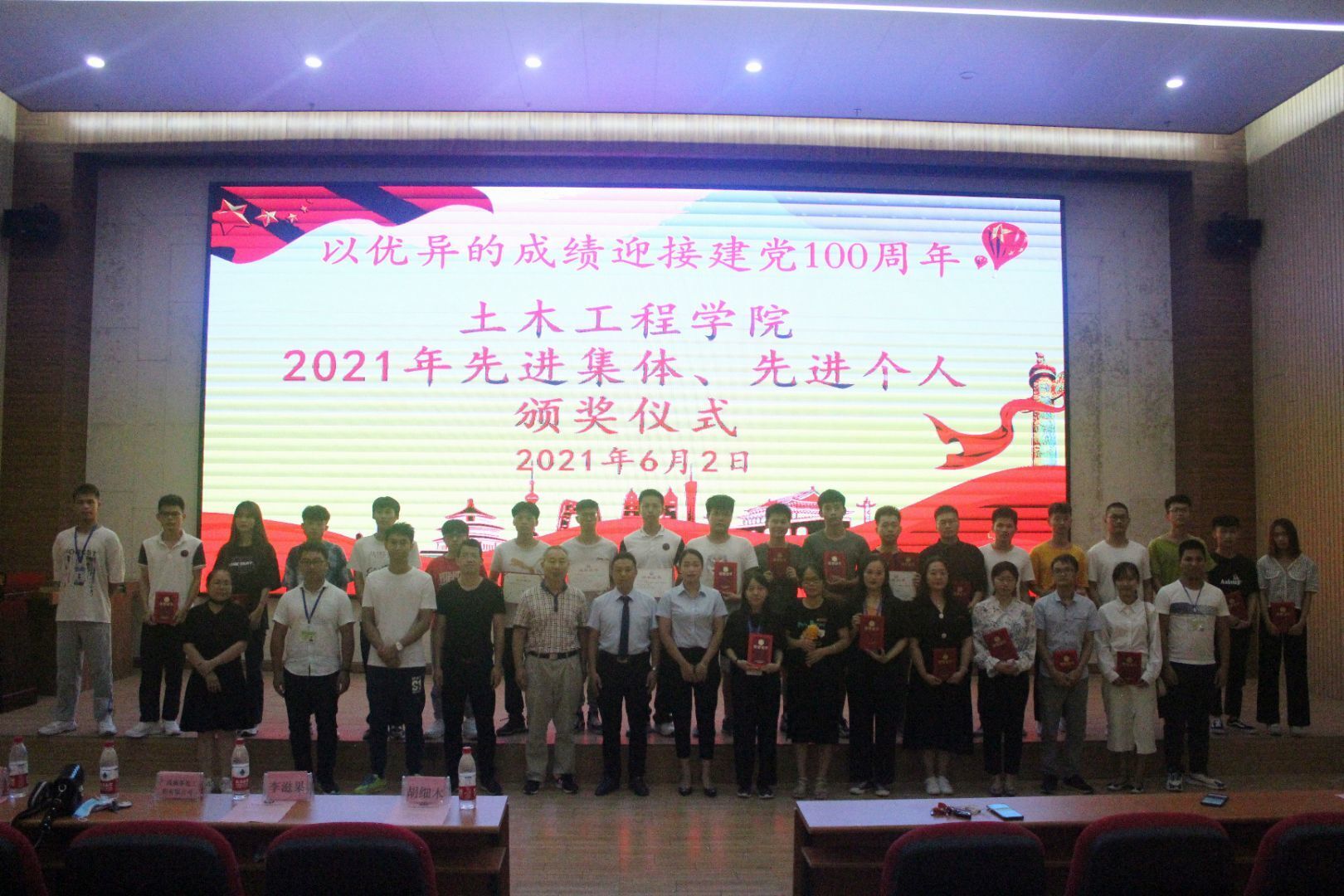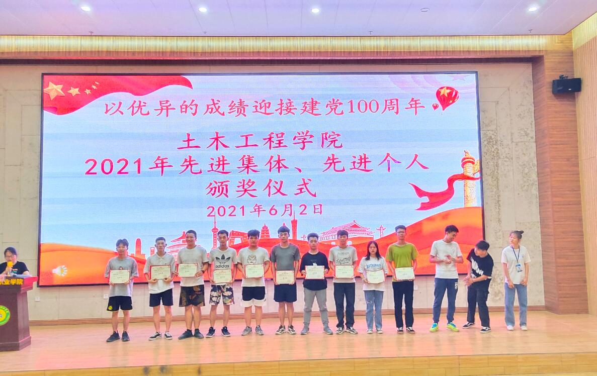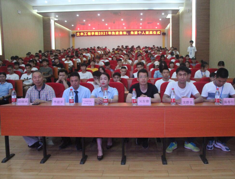 2021年6月2日,土木工程学院在图文信息大楼一楼学术报告厅举行2021年土木工程学院先进集体、先进个人颁奖仪式。出席颁奖仪式的有学校党委副书记、副校长胡细木、特邀嘉宾广西盛菲煌装饰工程公司李滋果经理、唐艳红女士、土木工程学院学生科科长陈春任、办公室主任黄连芳、土木工程学院第一党支部书记龙群良以及全体教师、部分班级的学生代表参加了会议。颁奖仪式由学校党委委员、土木工程学院党总支书记、副院长主持。颁奖会议在全体参会人员奏唱《国歌》中拉开序幕。