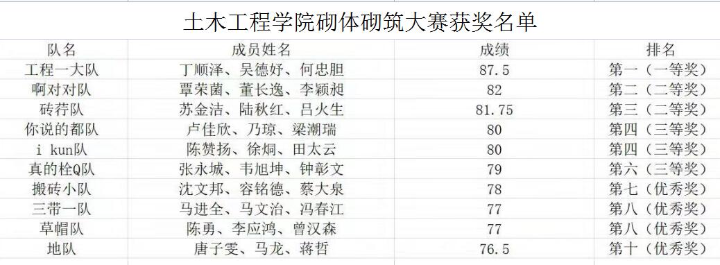 2022年6月12日星期日上午,由土木工程学院第一党支部和土木工程学院学生会共同主办的职业技能大赛系列活动之——砌体砌筑大赛在学院1号楼旁举行。此次比赛主要展现同学们对砌体砌筑知识的理解和应用,着力培养同学们的砌体砌筑兴趣、砌体砌筑实践应用能力,学校党委委员、校长助理蒋茂丽,土木工程学院学院副院长杨竟,土木工程学院部分教师出席此次比赛,本次比赛由龙群良、韦炳辉、黄小龙、黄照政、牙忠木等老师担任评委。