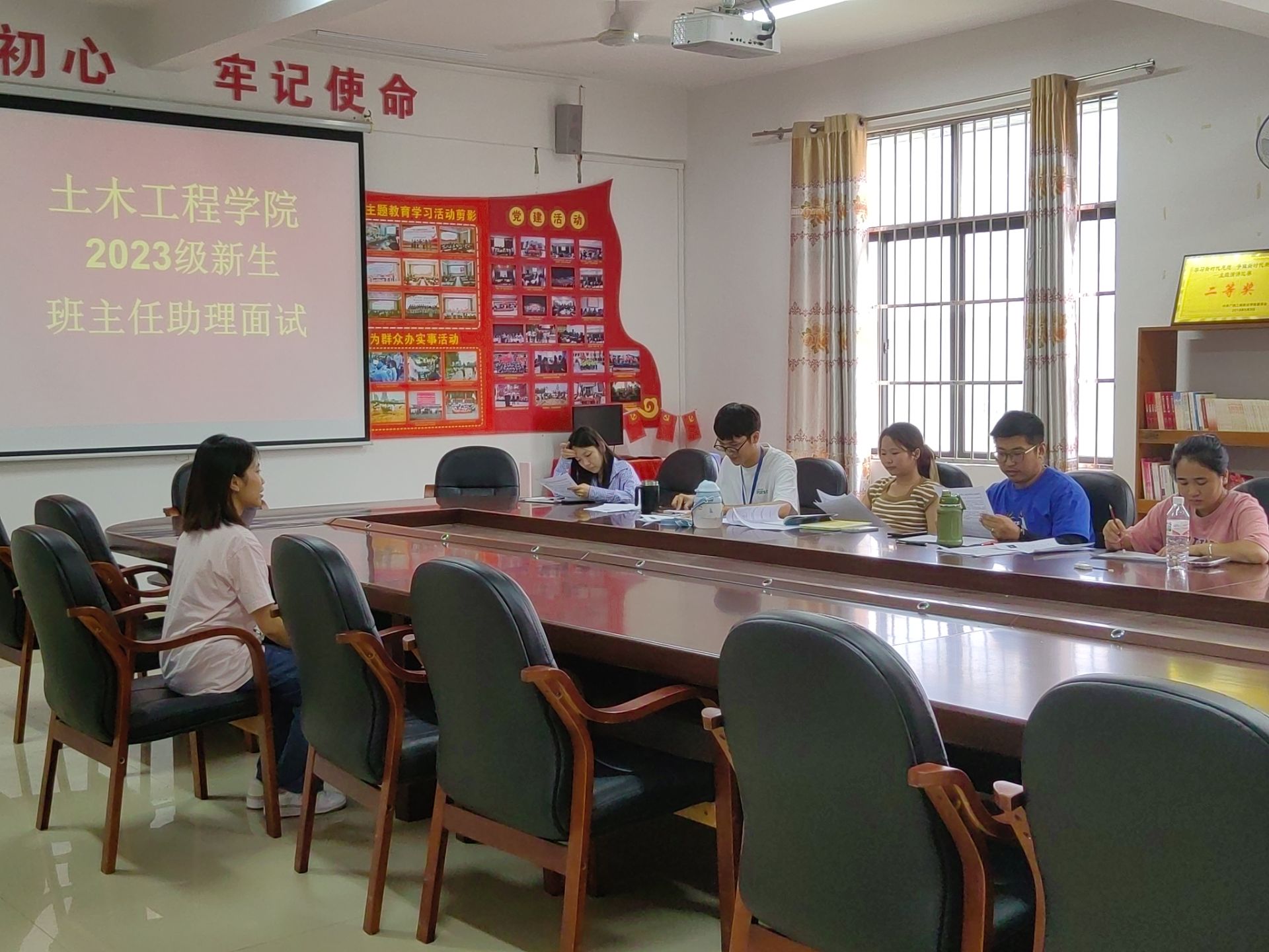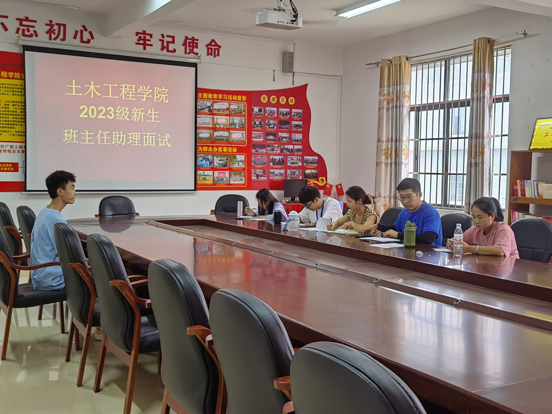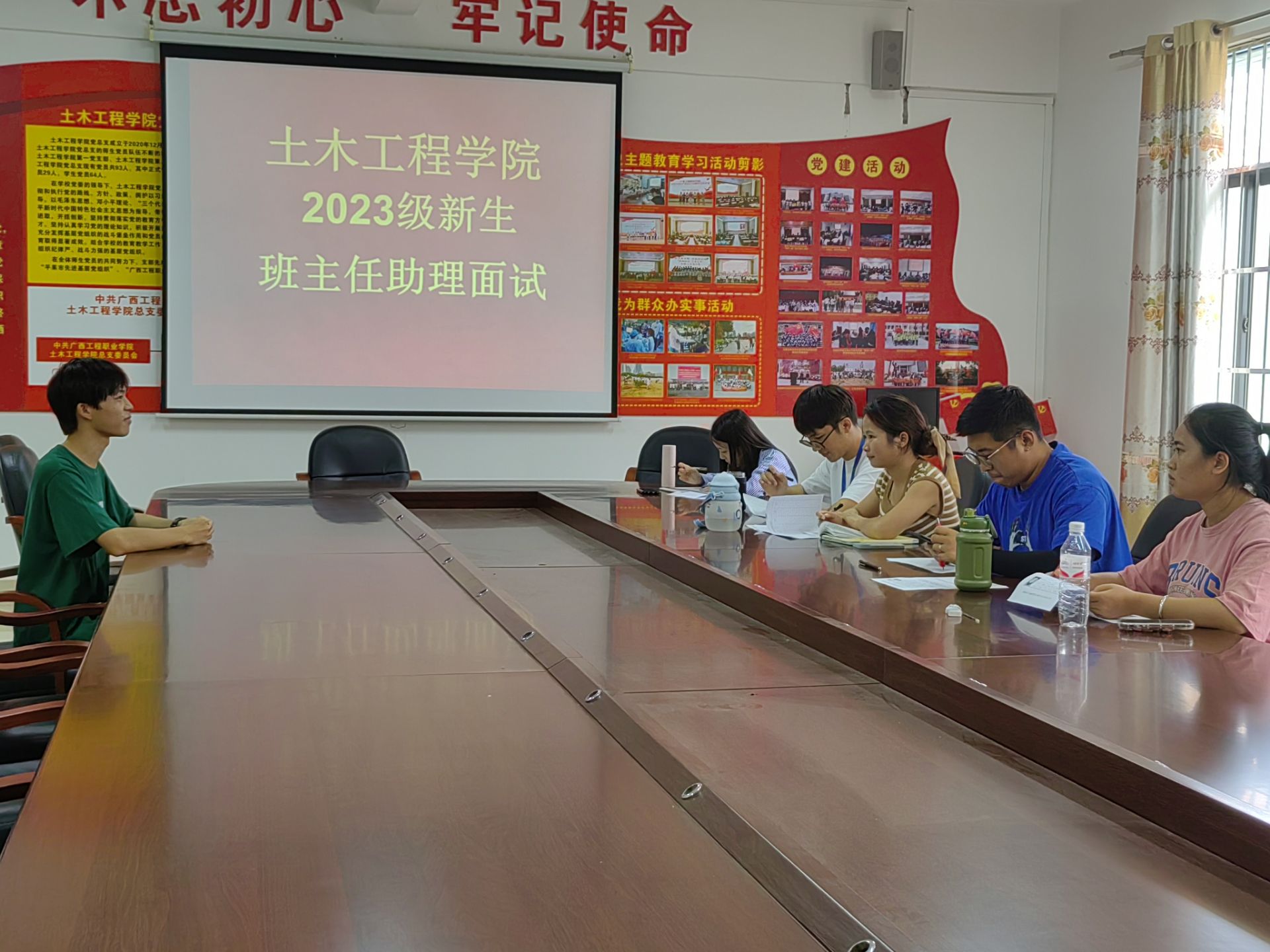 2023年8月29日下午16点30分,土木工程学院2023级新生辅导员助理选拔面试在土木工程学院301会议室举行,共有40位同学参与面试,黄建博老师、陆明梅老师、覃家珍老师、雷其致老师、余慧婷老师担任面试评委。