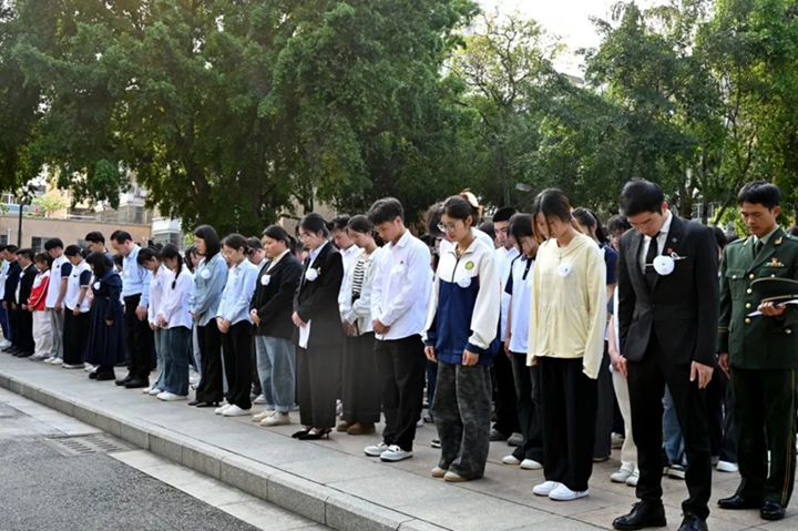 (二)深切缅怀16:30,缅怀仪式正式开始。在庄严肃穆的革命烈士纪念碑前,师生列队肃立,向革命先烈敬献小白花,全体默哀一分钟,表达对革命先烈的无限哀思和崇高敬意。