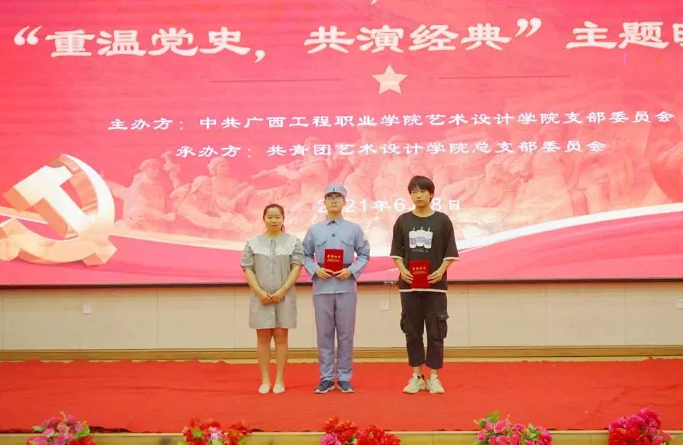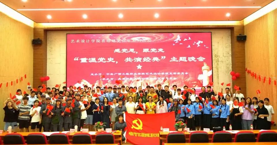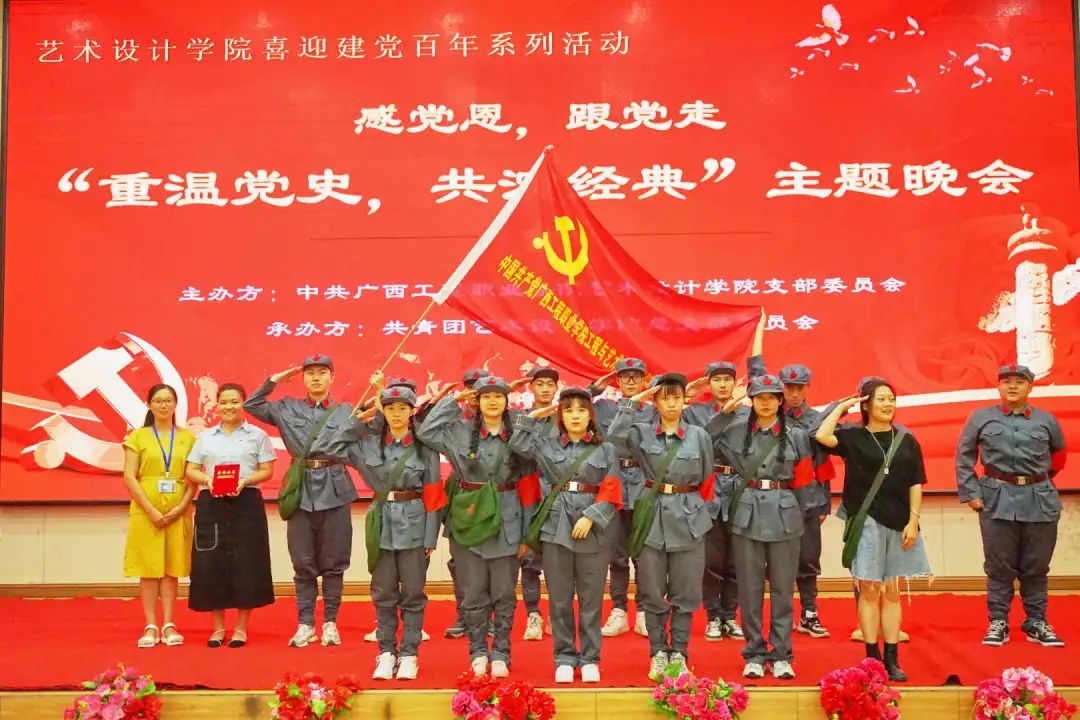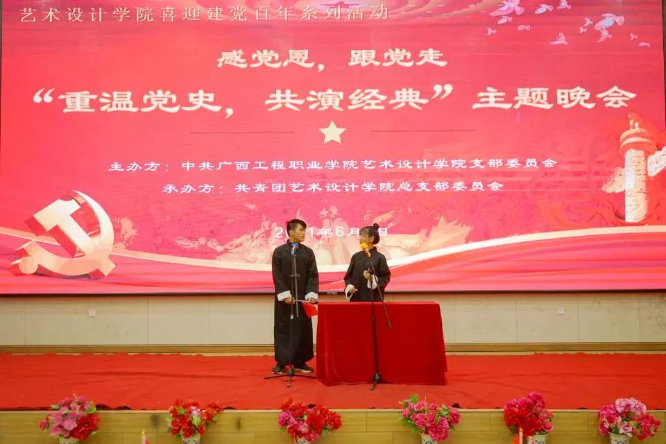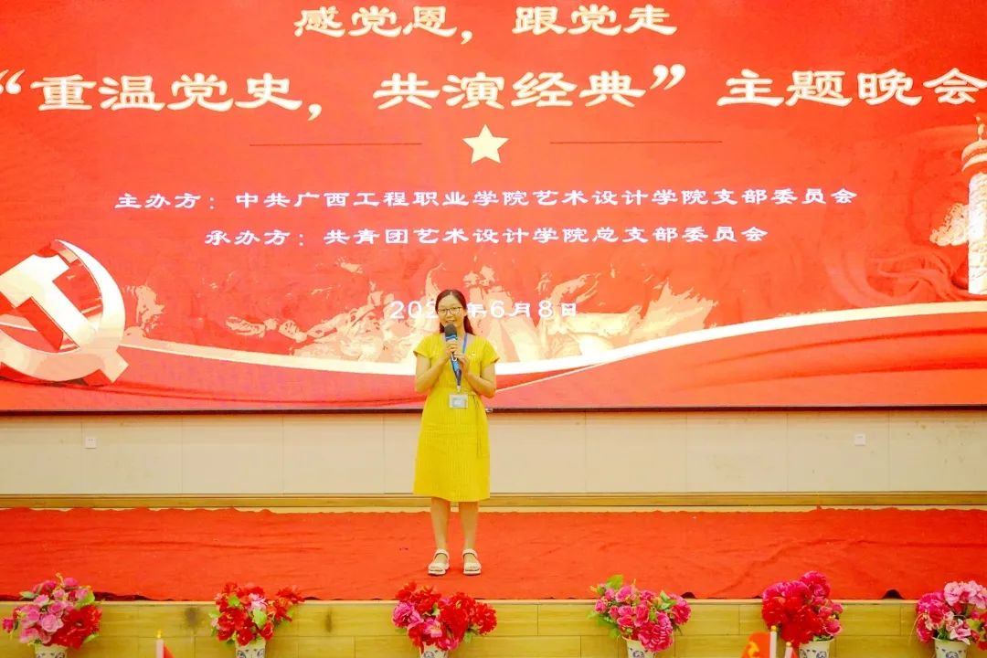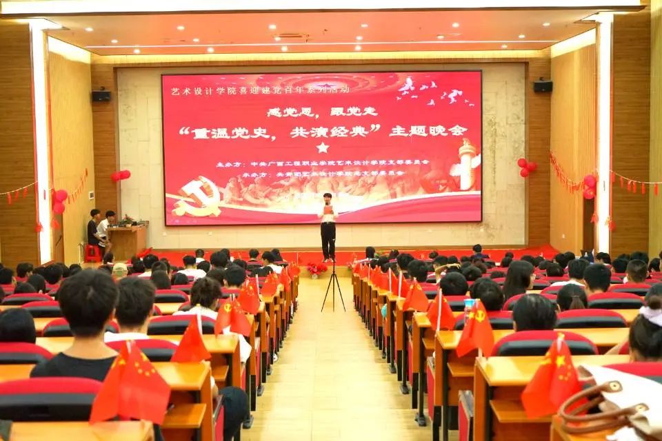 2021年6月8日晚,艺术设计学院在图文信息大楼一楼学术报告厅举办了听党话、感党恩、跟党走——“重温党史,共演经典”主题晚会。出席晚会现场的领导有学校副校长林萌,艺术设计学院党支部书记、副院长覃凤姣,党支部委员陆闲,党支部委员、办公室主任王艳,分团委书记潘翠萍,教研室主任李花,党支部全体师生党员、党员发展对象、入党积极分子等也观看了本次晚会。