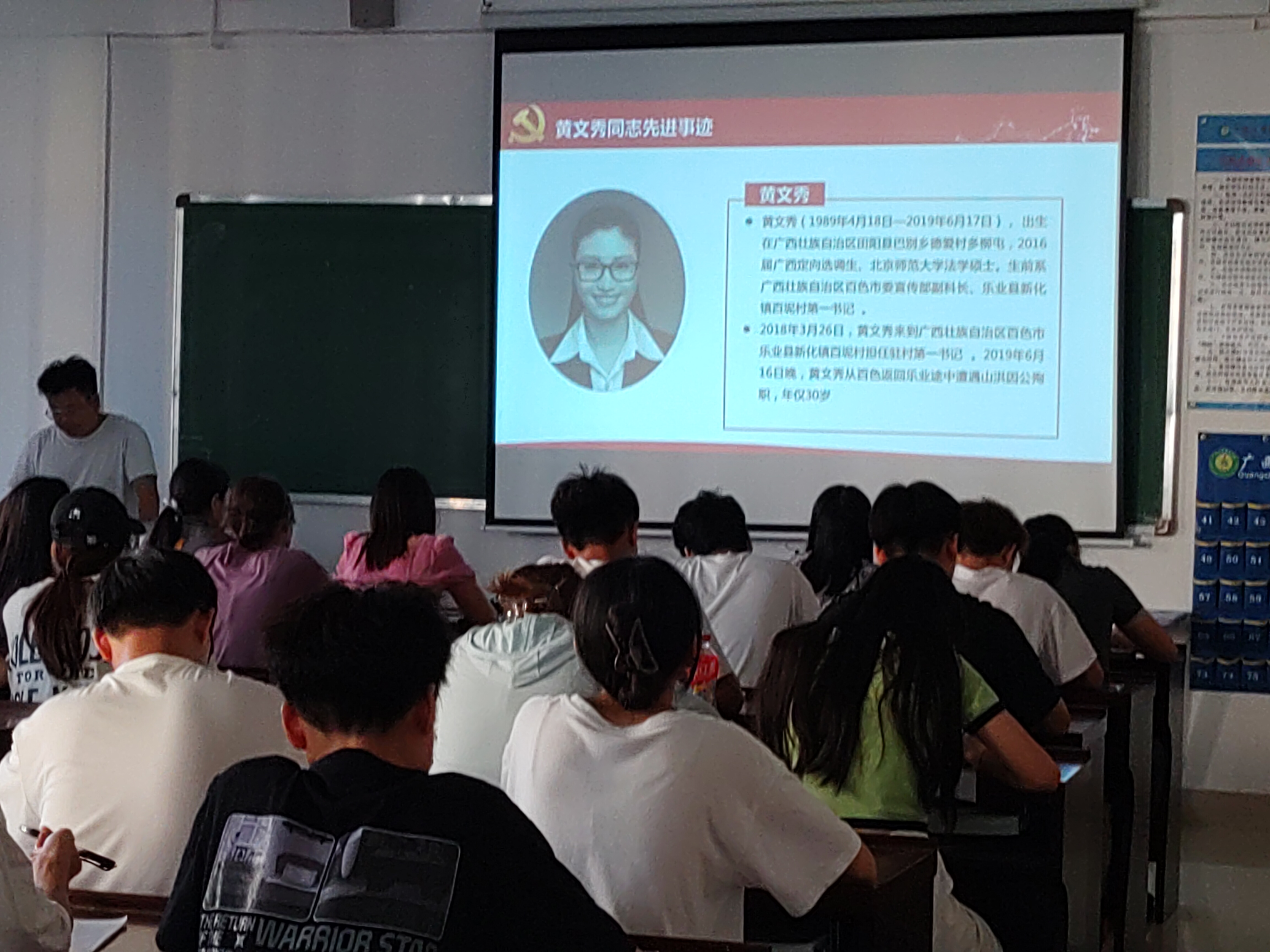 本次活动由党支部书记岑易精同志主持开展,通过观看纪录片,主题党课学习的方式,支部全体党员教师、发展对象、积极分子们更加生动细腻地了解了黄文秀同志从出生成长、刻苦求学、毕业回乡、驻村扶贫、青春奋斗的一生。