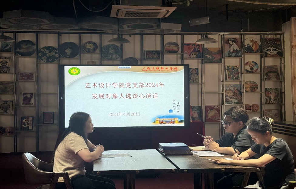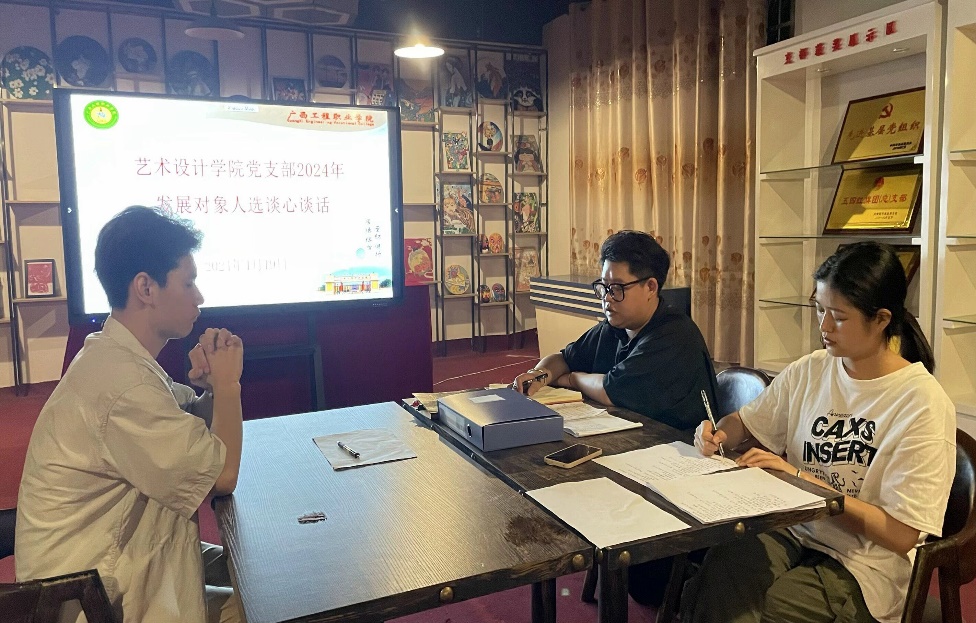 为进一步了解发展对象人选在思想、学习、工作、生活等方面的情况,确保党员发展质量,近期,我院党支部书记覃凤姣、副书记赵志辉,支部委员陆闲、苏媚,辅导员田红静、曹远翔、黄玉莹在党支部书记室、党员阅读区进行2024年上半年发展对象人选谈话工作,谈话对象为党支部培养考察期满一年的入党积极分子。