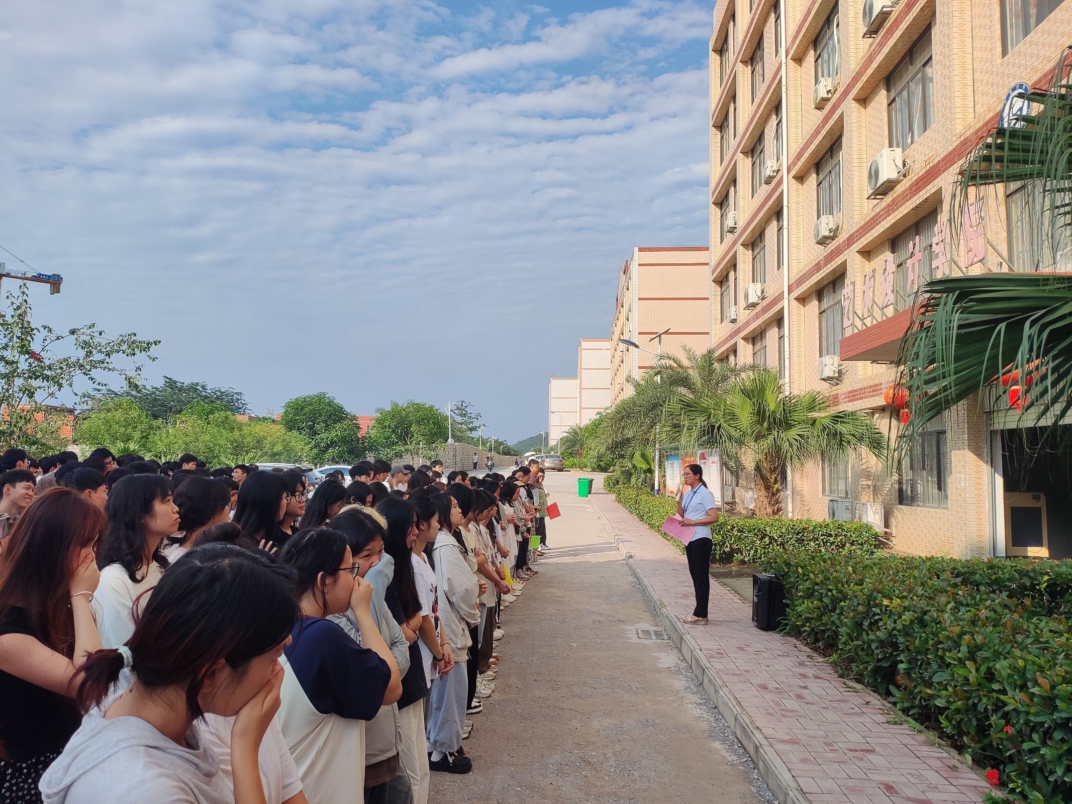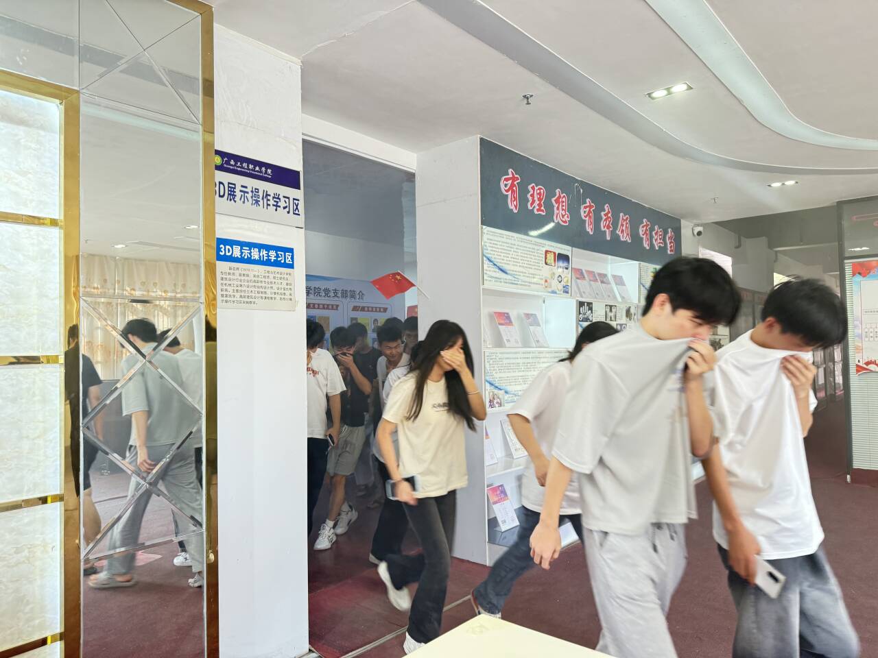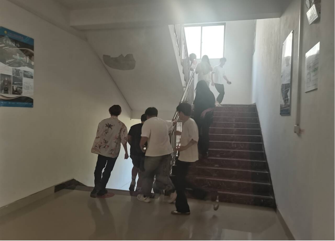在活动过程中,实验实训室浓烟滚滚,室内报警器响起后,同学们手捂住口鼻,有序撤离到学院门口的安全地带,所有师生均在一分钟内安全撤离到指定位置。