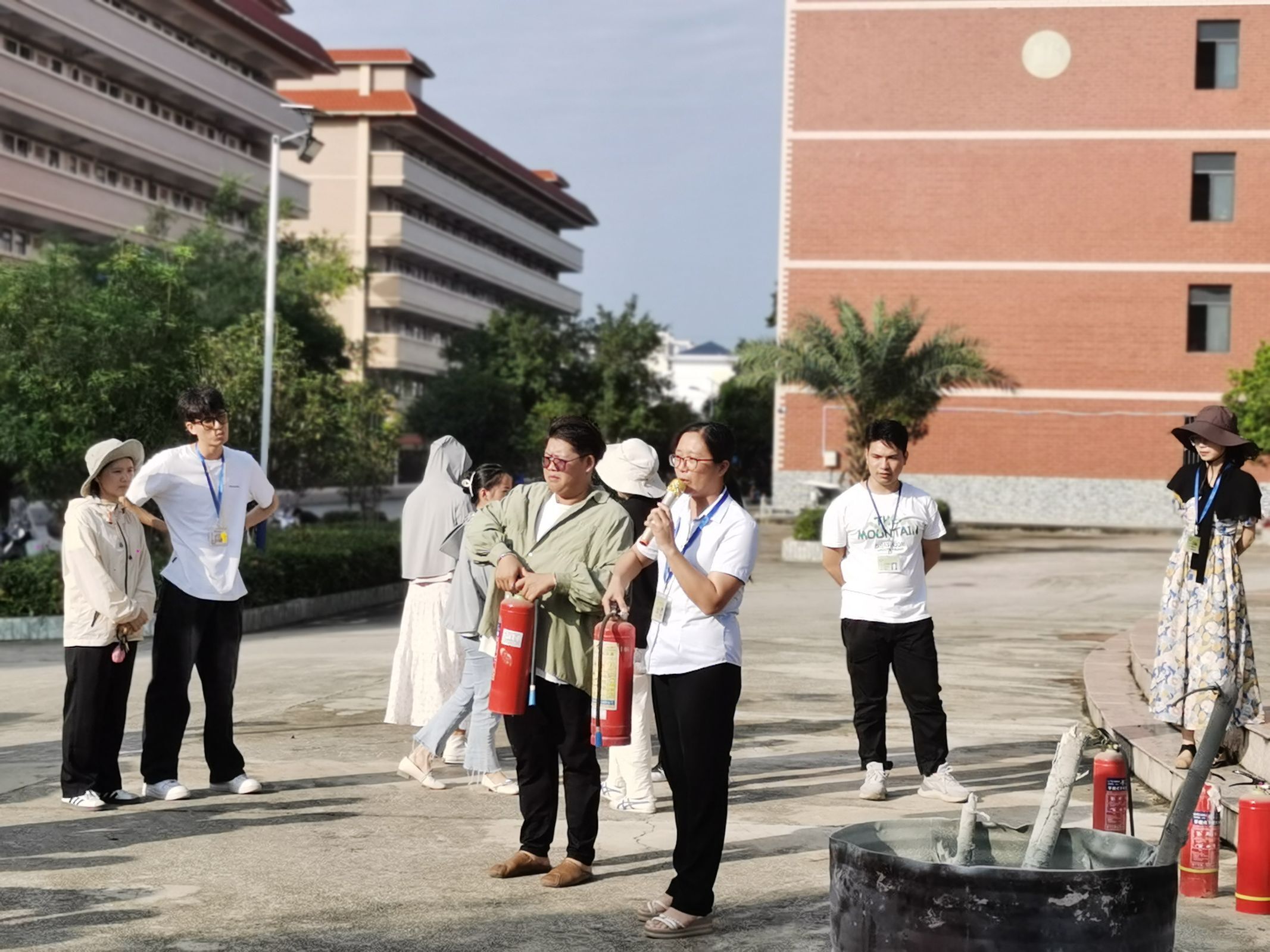 全部安全疏散完毕后,院长覃凤姣讲解灭火器的使用方法和注意事项,向同学们讲解了干粉灭火器“一提二拨三瞄四压”的操作方法,赵志辉和李海凤老师进行了现场演示灭火器的操作程序,让老师同学们掌握正确使用灭火器的方法。