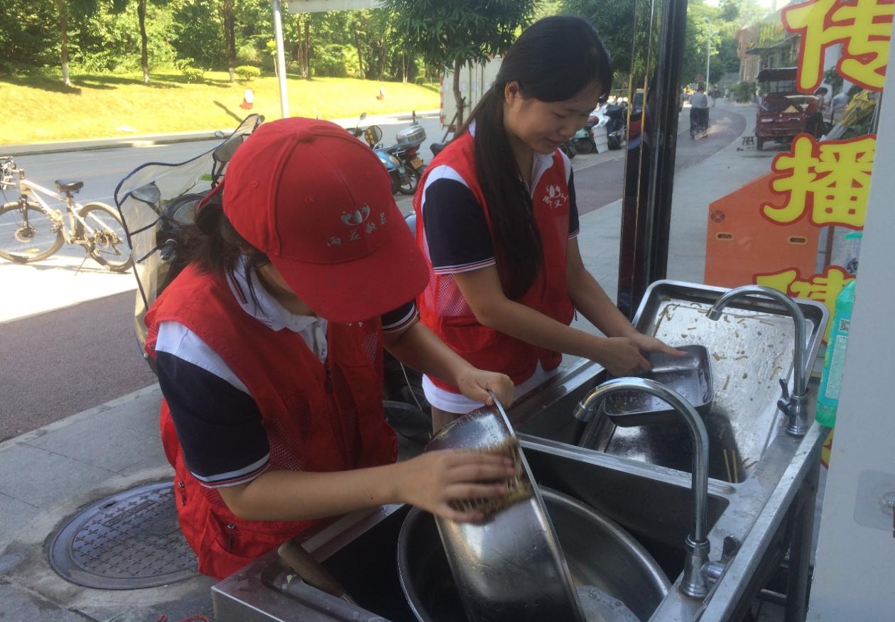 图为志愿者们清洗餐具