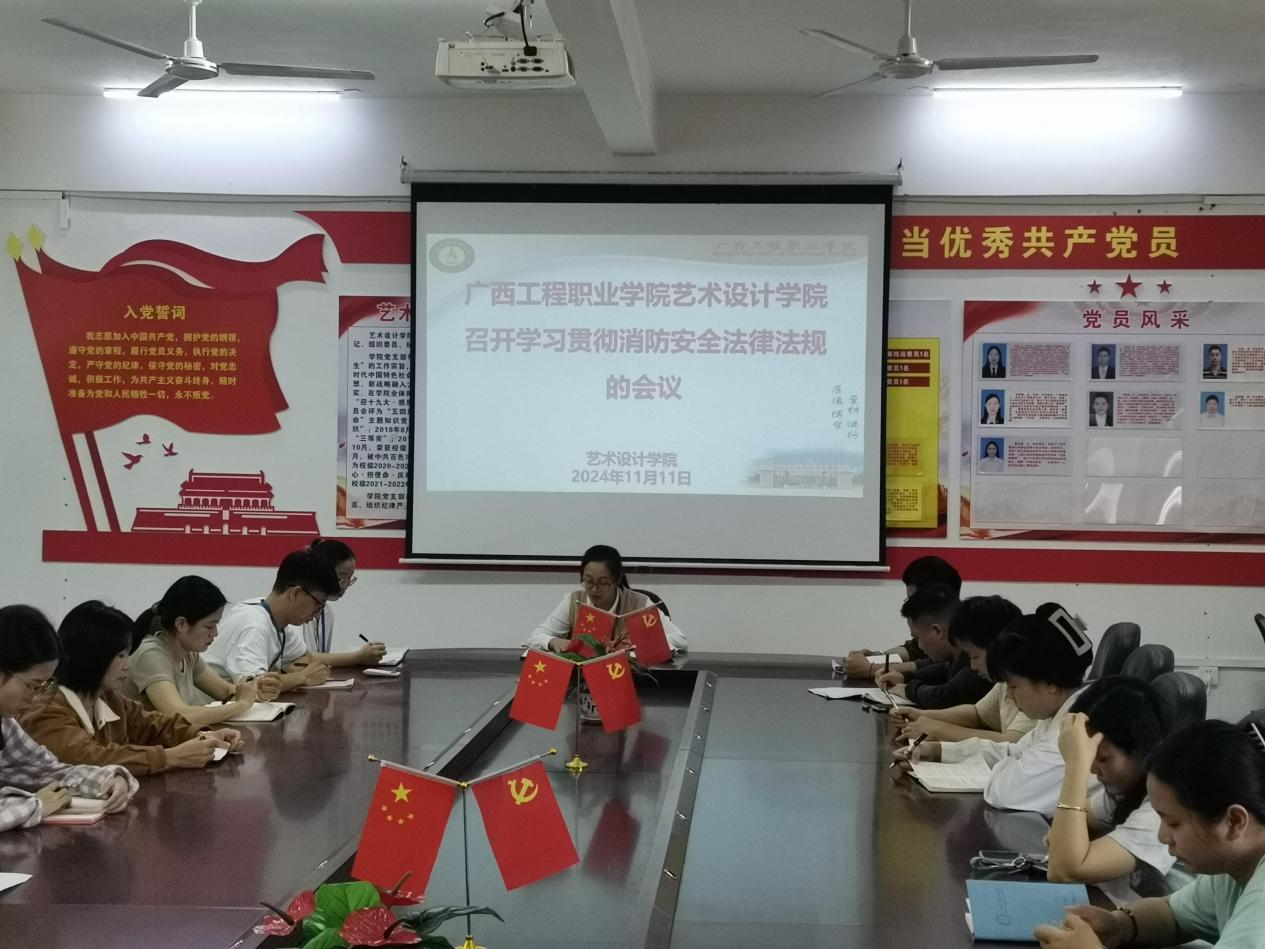 2024年11月11日,我院在学院三楼党员活动室召开学习贯彻消防安全法律法规专题会议,学院全体教师参加会议,会议由学院院长覃凤姣主持。