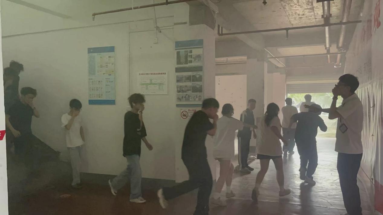 消防安全演练过程中,在艺术设计学院楼内模拟火灾场景,浓烟迅速弥漫,警报声随即响起。参与演练的师生迅速反应,按照应急预案,任课老师组织同学们用手捂住口鼻,采取低姿势快速前进,在安全出口处教师的引导下沿指定疏散路线有序撤离。在短短一分钟内,全体师生安全撤离至学院门口的安全地带,展现了高效的应急反应能力。