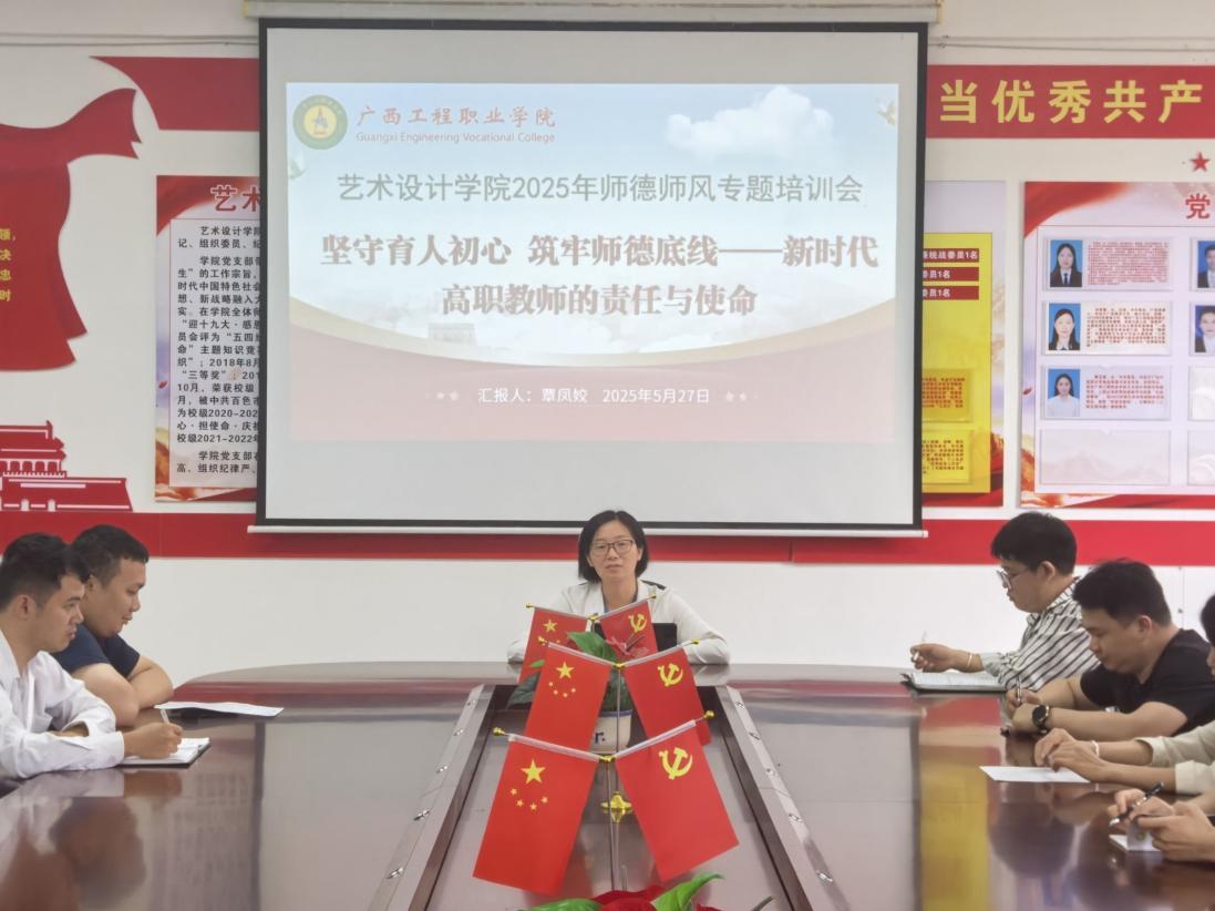 为全面贯彻党的教育方针,深化新时代教师队伍建设,全面提升教师职业道德素养,强化教师立德树人的责任感和使命感,艺术设计学院于2025年5月27日14:30在学院三楼党员活动室召开了全体教职工师德师风专题培训会。此次培训会由学院党支部书记、院长覃凤姣主讲,学院全体教师参加。