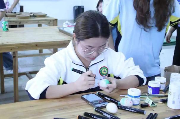 以“传统+创意”双主题绘制彩蛋:传统主题围绕艾草、龙舟等自然纹样与吉祥符号,融入青、红、黄、白、黑五行色彩;创意主题则涵盖Q版屈原、星空几何等新颖元素,师生们还在彩蛋上书写祝福语,让古老习俗焕发出青春活力。