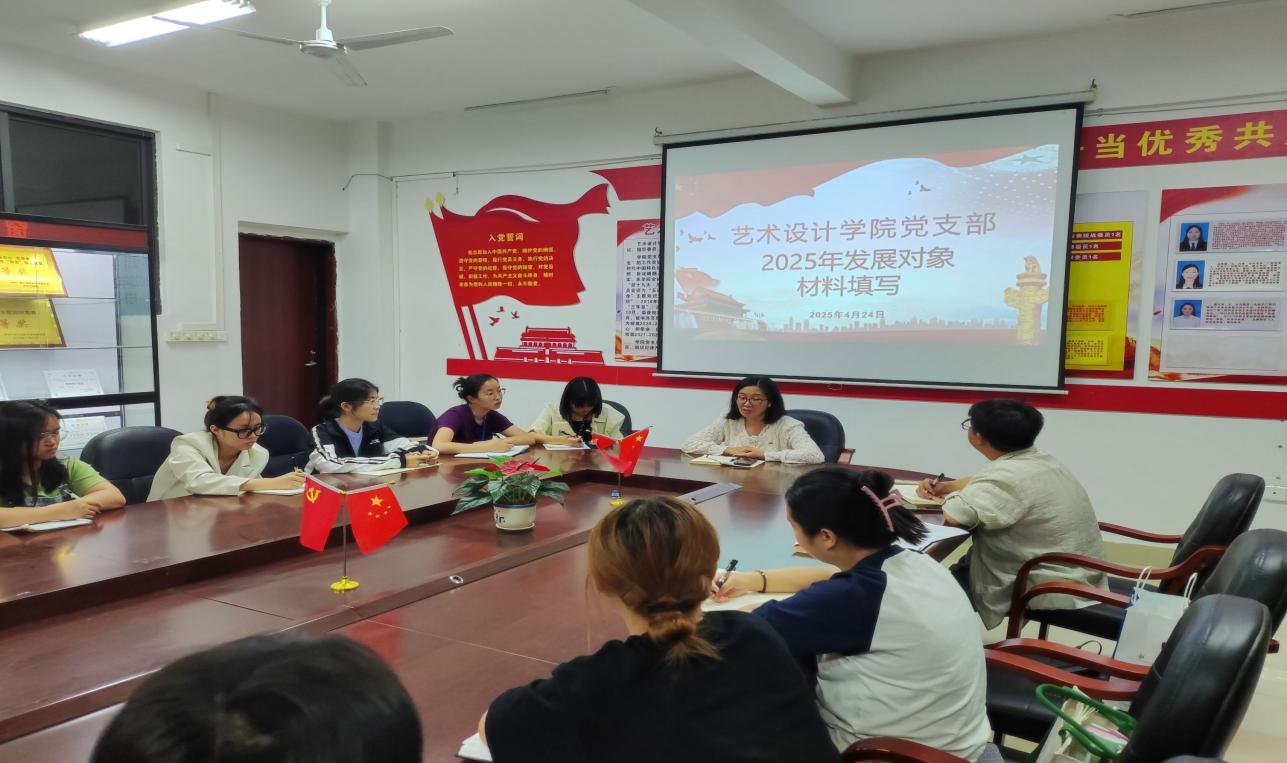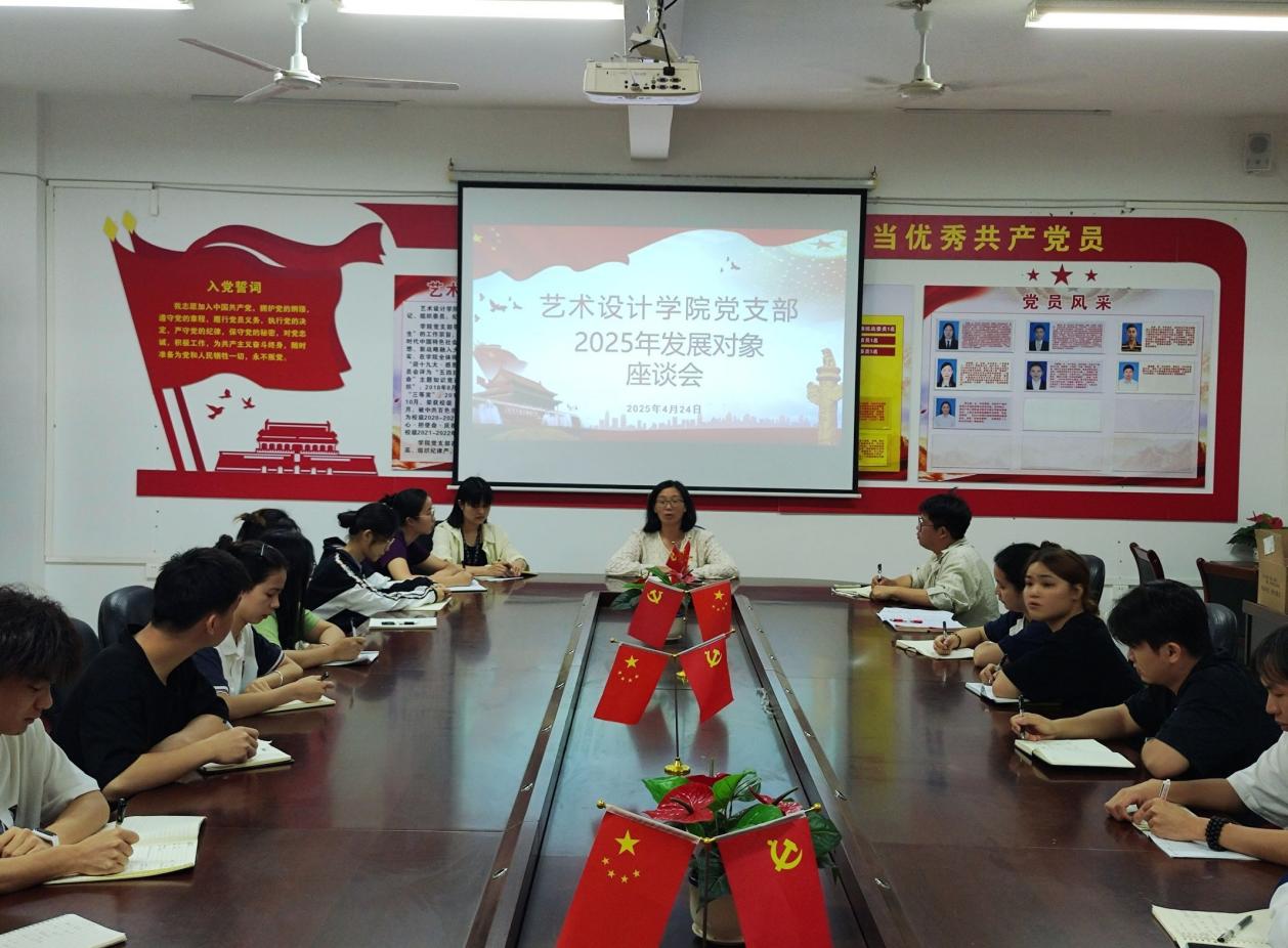 2025年4月24日晚,艺术设计学院党支部在学院三楼党员活动室召开了2025年发展对象座谈会。学院党支部书记覃凤姣、副书记赵志辉、纪律委员苏媚出席本次座谈会,并与发展对象深入交流。此次座谈会旨在严把党员发展“入口关”,切实提升发展对象的思想政治素质。