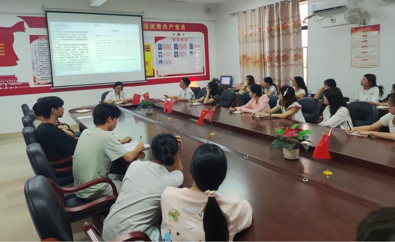 接着进入交流分享环节,入党积极分子代表莫人聪同学结合自身实践经历,分享学习党的理论知识的心得体会。他表示:“作为新时代的艺术设计学子,我们要以创新为笔、以担当为墨,创作出更多有温度、有深度的作品,为社会发展贡献青春力量。”与会师生围绕“如何在专业实践中践行初心使命”展开热烈讨论,现场气氛热烈而庄重。