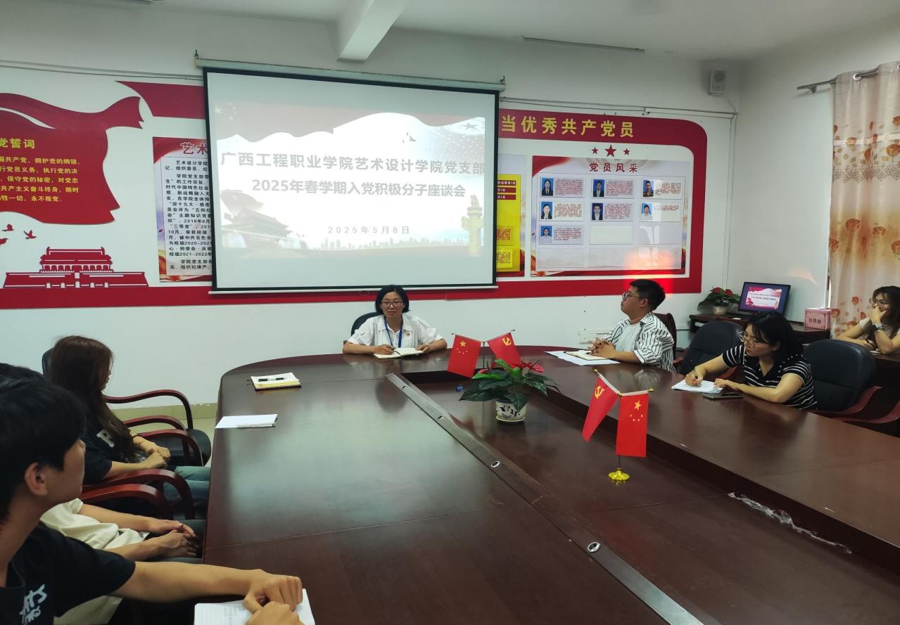 2025年5月8日下午,艺术设计学院党支部在学院三楼党员活动室召开2025年春学期入党积极分子座谈会。学院党支部书记覃凤姣、副书记赵志辉、宣传兼统战委员曹远翔老师出席本次座谈会,与入党积极分子展开交流。此次座谈会旨在进一步加强入党积极分子的培养教育,引导青年学子坚定理想信念、勇担时代使命。