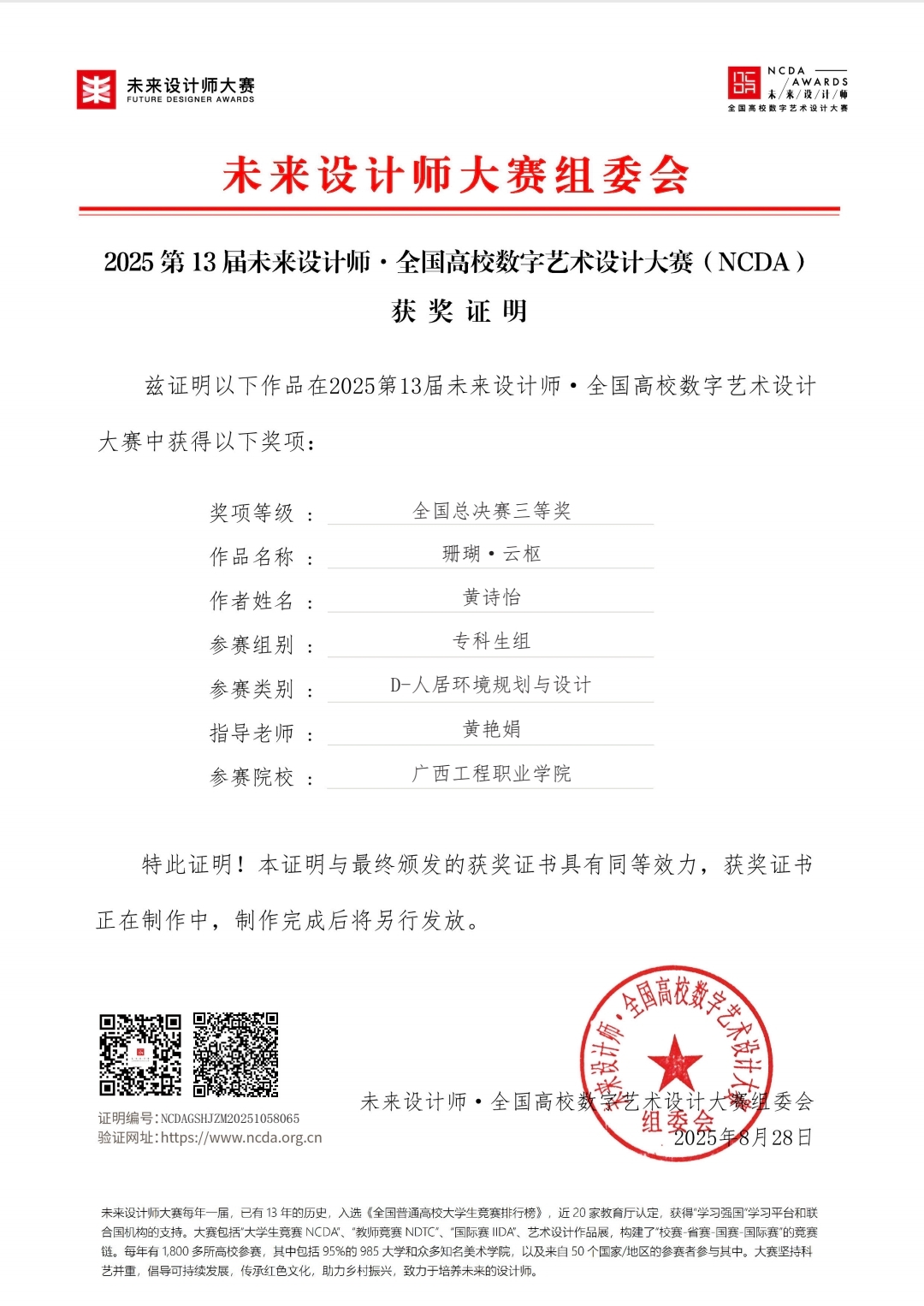 其中,由黄艳娟老师指导、黄诗怡同学创作的作品《珊瑚·云枢》(参赛类别:人居环境规划与设计)凭借其独特的创意与精湛的表现,一举夺得广西赛区一等奖,并成功晋级全国总决赛,最终荣获全国总决赛三等奖的优异成绩,为学院赢得了荣誉。