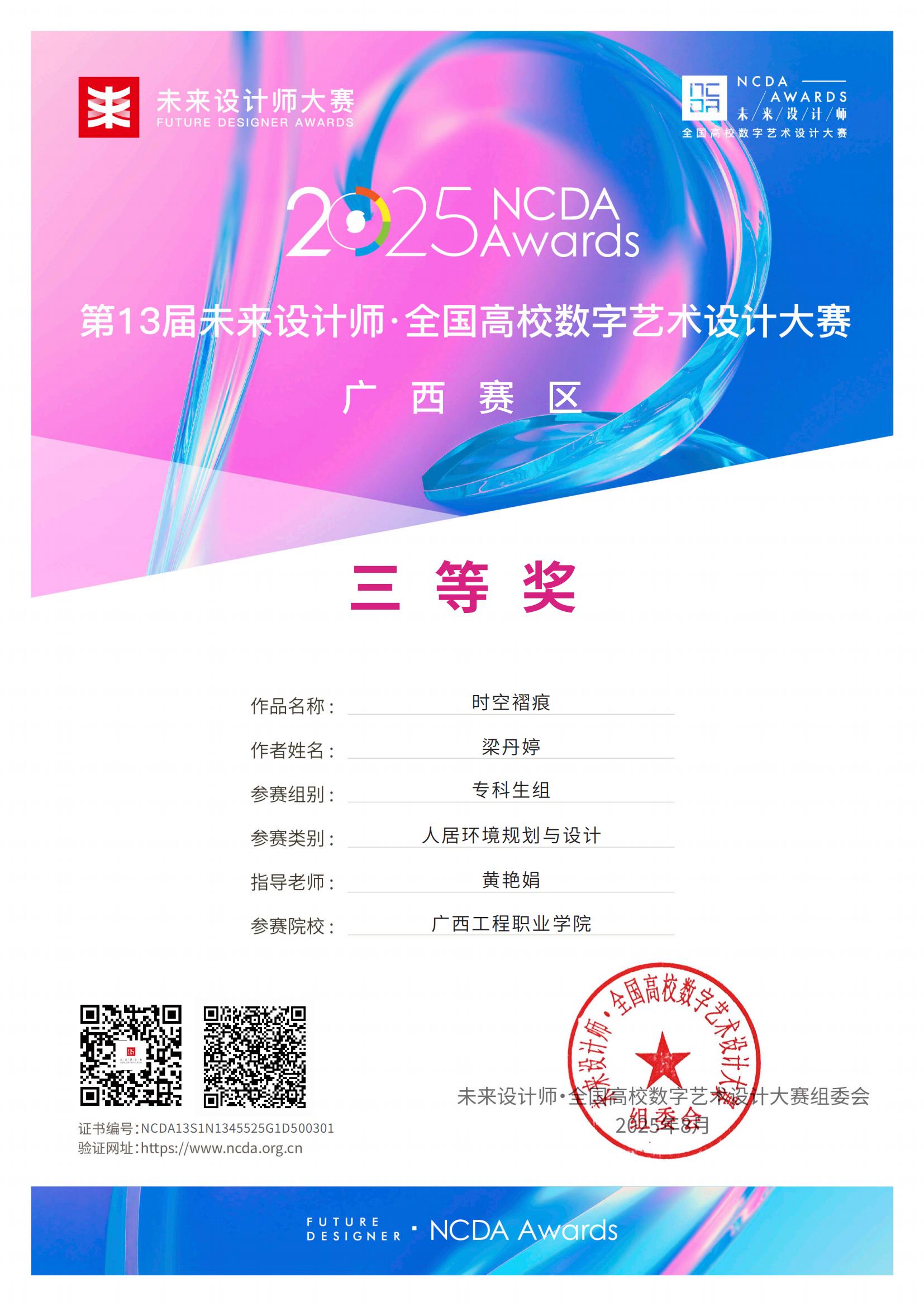 近日,2025年第13届未来设计师·全国高校数字艺术设计大赛(NCDA)评选结果揭晓。beat365唯一官网艺术设计学院学生表现优异,共斩获全国总决赛三等奖1项、广西赛区一等奖1项、广西赛区二等奖1项、广西赛区三等奖2项。黄艳娟、谭雪融两位教师荣获“优秀指导教师”称号。