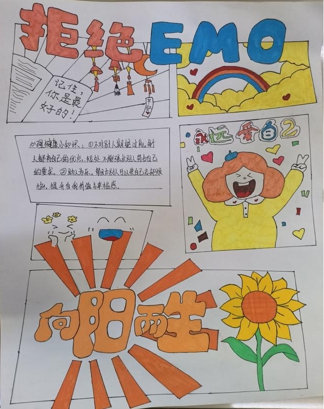 心理绘画不仅为同学们搭建了展现创意与才华的舞台,更通过艺术创作与知识探索的深度融合,有效激发了大家主动学习心理健康知识的热情,提升了信息整合与艺术表达能力,有力推动了心理健康知识的普及,营造出理解、关爱与成长的良好氛围,对积极向上的和谐校园起到重要促进作用,让心灵之花在校园的每一处悄然绽放。