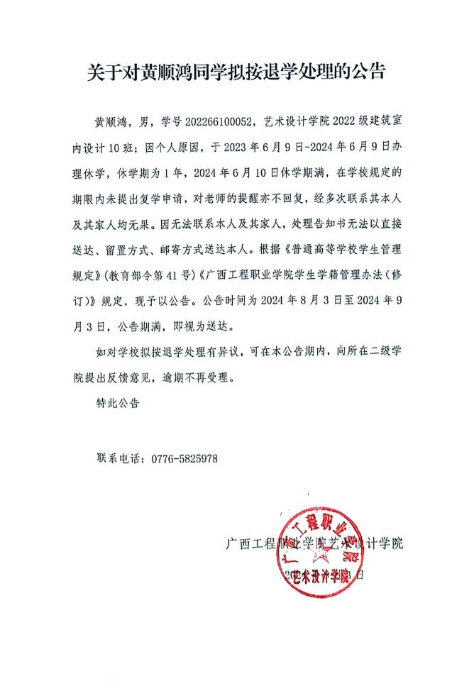 上一篇:关于对杨家辉同学拟按退学处理的公告