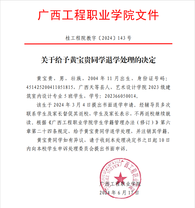 根据《普通高等学校学生管理规定》(教育部令第41号)、《beat365唯一官网学生学籍管理办法(修订)》第二十四条规定,给予黄宝贵同学退学处理,并注销其学籍。