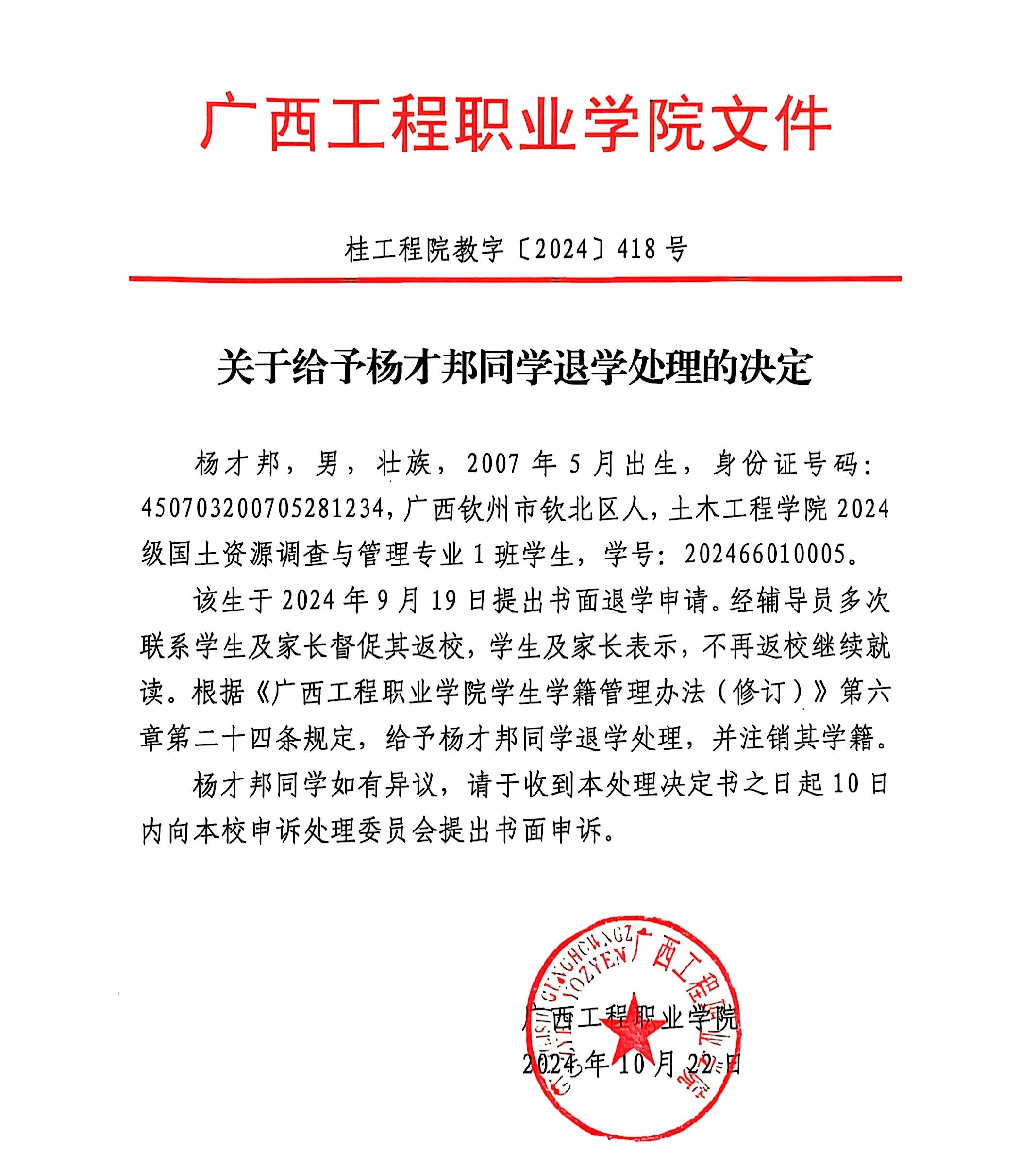 根据《普通高等学校学生管理规定》(教育部令第41号)、《beat365唯一官网学生学籍管理办法(修订)》第二十四条规定,给予杨才邦同学退学处理,并注销其学籍。