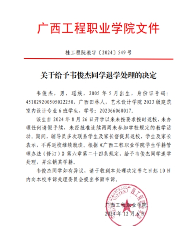 附件:关于给予韦俊杰同学退学处理的决定