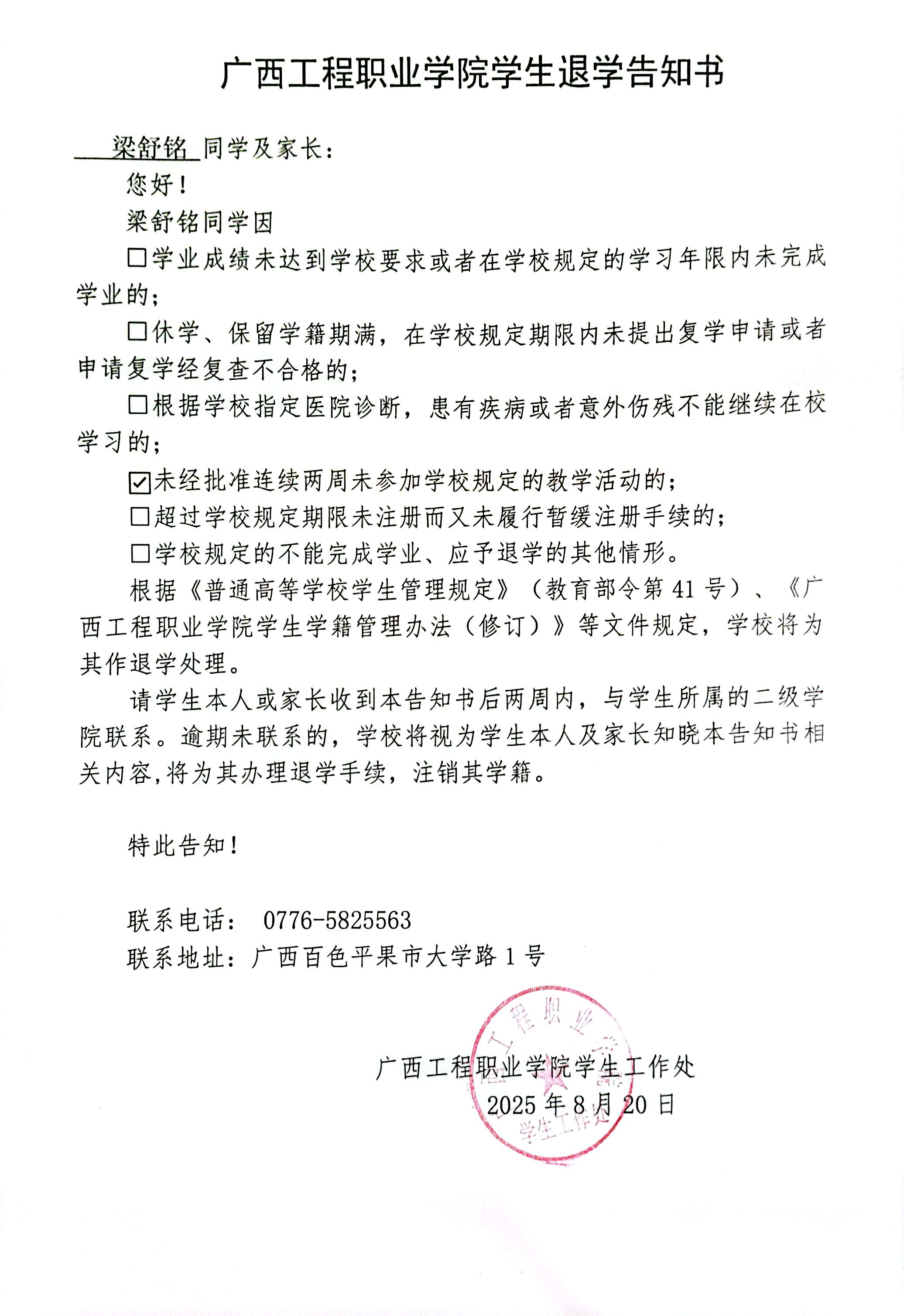 梁舒铭,男,学号:202266060018,艺术设计学院2023级建筑室内设计3班学生;该生于2025年8月4日返校,2025年8月7日离校,未经批准连续两周未参加学校规定的教学活动,对老师的提醒亦不回复,经多次联系学生本人及其家长均无果。学校于2025年8月21日邮寄退学告知书,因不是学生本人及其家人签收,处理告知书无法以直接送达、留置方式、邮寄方式送达本人。根据《普通高等学校学生管理规定》(教育部令第41号)、《beat365唯一官网学生学籍管理办法(修订)》规定,现通过beat365唯一官网艺术设计学院官网予以公告,公告时间为2025年9月11日至2025年10月11日,公告期满,即视为送达。