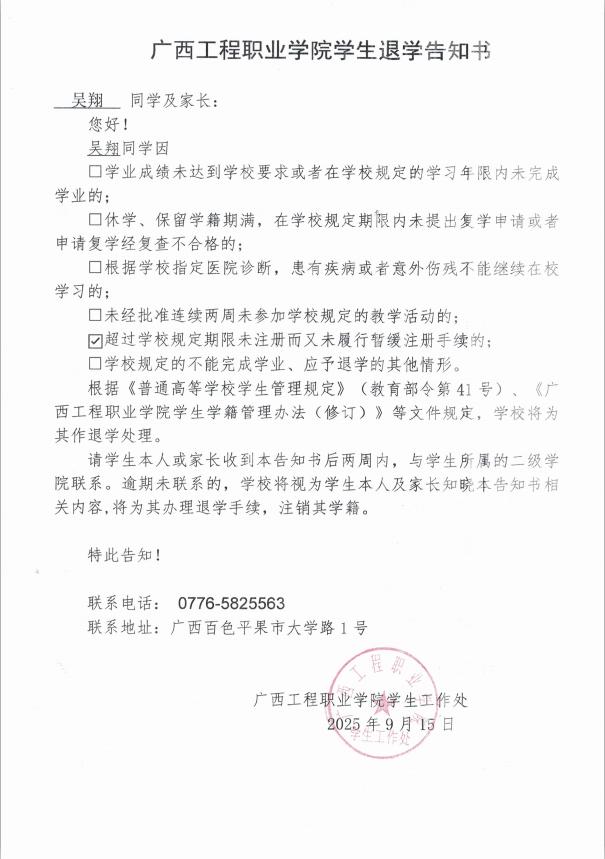 吴翔,男,学号:202466020004,艺术设计学院2024级建筑室内设计2班学生;于2025年8月31日开学至今未返校,超过学校规定期限未注册而又未履行暂缓注册手续,对老师的提醒亦不回复,经多次联系其本人及其家人均无果。学校于2025年9月16日邮寄退学告知书,因不是学生本人及其家人签收,处理告知书无法以直接送达、留置方式、邮寄方式送达本人。根据《普通高等学校学生管理规定》(教育部令第41号)、《beat365唯一官网学生学籍管理办法(修订)》规定,现通过beat365唯一官网艺术设计学院官网予以公告,公告时间为2025年9月26日至2025年10月25日,公告期满,即视为送达。