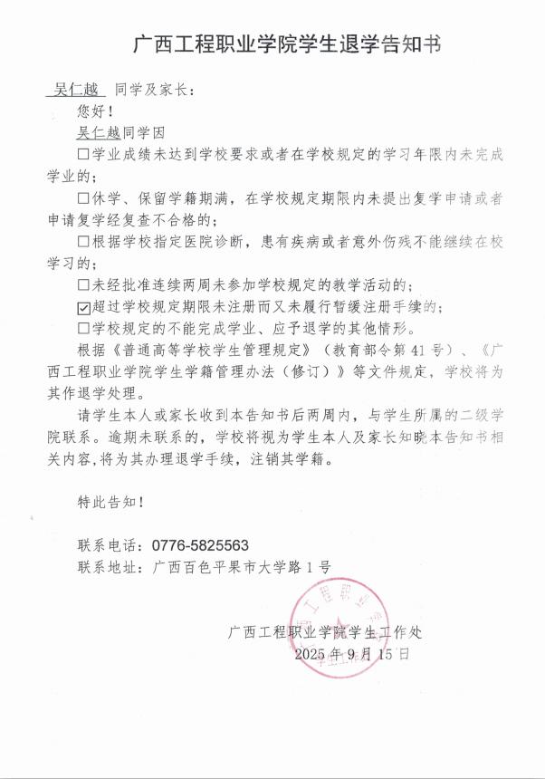 吴仁越,男,学号:202447020041,艺术设计学院2024级广告艺术设计2班学生;于2025年8月31日开学至今未返校,超过学校规定期限未注册而又未履行暂缓注册手续,对老师的提醒亦不回复,经多次联系其本人及其家人均无果。学校于2025年9月16日邮寄退学告知书,因不是学生本人及其家人签收,处理告知书无法以直接送达、留置方式、邮寄方式送达本人。根据《普通高等学校学生管理规定》(教育部令第41号)、《beat365唯一官网学生学籍管理办法(修订)》规定,现通过beat365唯一官网艺术设计学院官网予以公告,公告时间为2025年9月26日至2025年10月25日,公告期满,即视为送达。