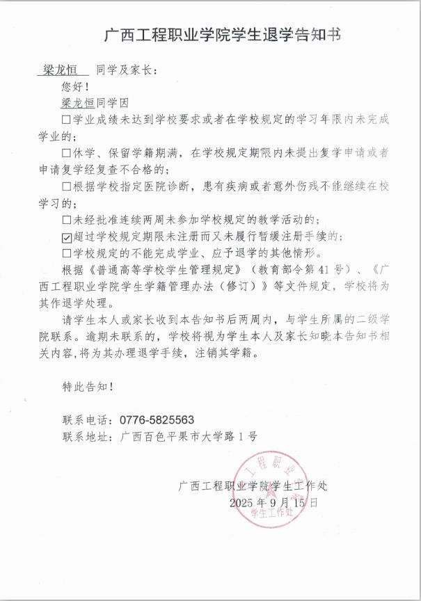 梁龙恒,男,学号:202466010038,艺术设计学院2024级建筑室内设计1班学生;于2025年8月31日开学至今未返校,超过学校规定期限未注册而又未履行暂缓注册手续,对老师的提醒亦不回复,经多次联系其本人及其家人均无果。学校于2025年9月16日邮寄退学告知书,因不是学生本人及其家人签收,处理告知书无法以直接送达、留置方式、邮寄方式送达本人。根据《普通高等学校学生管理规定》(教育部令第41号)、《beat365唯一官网学生学籍管理办法(修订)》规定,现通过beat365唯一官网艺术设计学院官网予以公告,公告时间为2025年9月30日至2025年10月29日,公告期满,即视为送达。